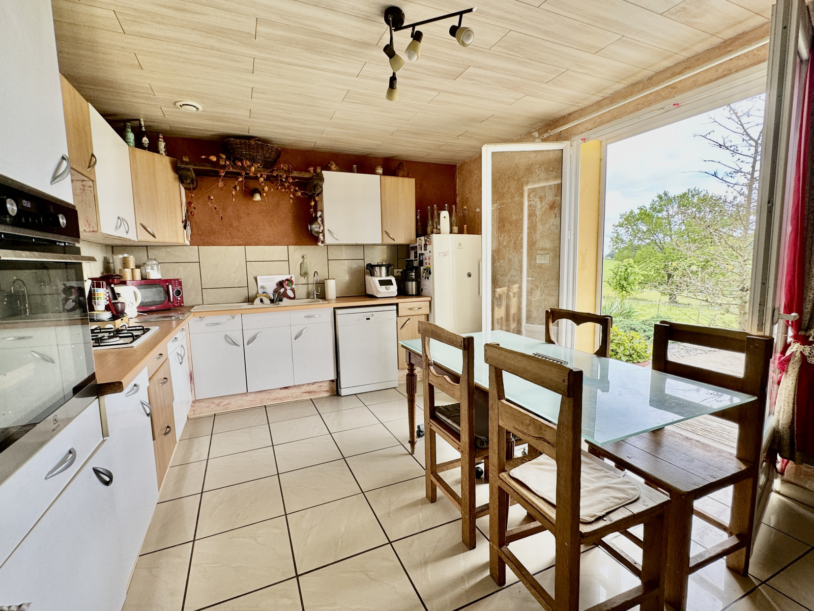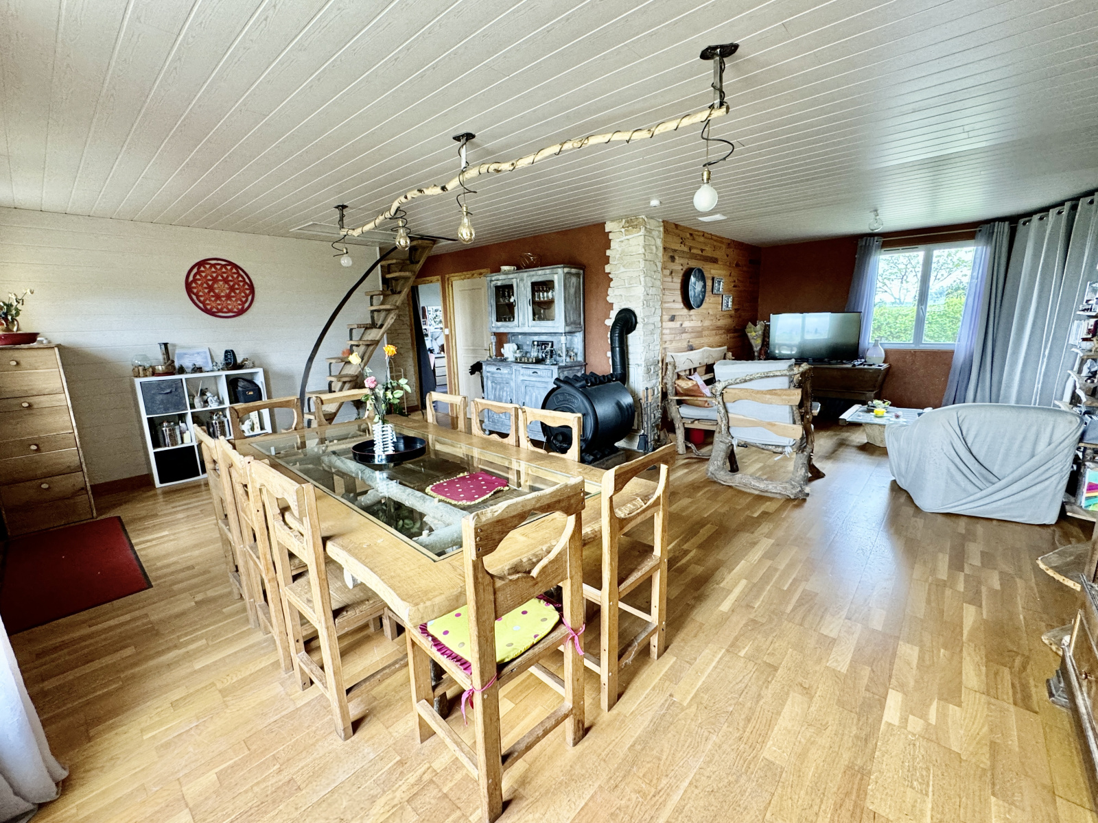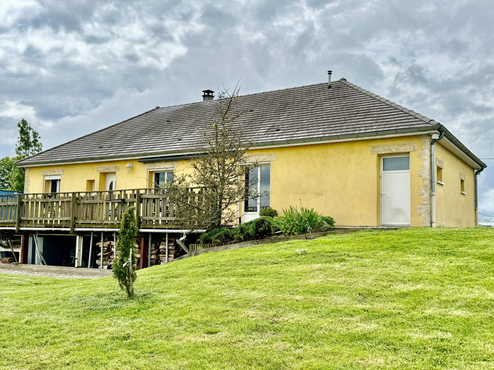 Gueugnon (71130)Proche de GUEUGNON, au calme, sans vis à vis, avec vue panoramique, ravissante maison contemporaine de plain-pied sur un terrain clos de plus 4350 m2. Erigée en 2008 avec des matériaux écologiques, d'une superficie de 150 m2; cette demeure est agencée comme suit: très belle pièce à vivre de 45 m2 avec poêle à bois ouvrant sur la grande terrasse de plus de 60 m2 ainsi que la cuisine familiale équipée indépendante, 4 chambres, une salle d'eau, une buanderie/ cellier avec porte d'accès sur l'exterieur.Une grande terrasse de 60 m 2, un sous-sol de 145 m2, une cave de 13 m2, un tènement de 80 m2 pouvant accueillir un préau pour garer des véhicules, des garages sous la terrasse, un bucher, un verger, un potager en permaculture, 4000L de réservoir d'eau de pluie viennent parfaire cette propriété.Volets roulants électriques, domotique, portail d'entrée électrique et panneaux photovoltaïques apportant un rendement de 2000€/an. Terrain piscinable.Proche de toutes commodités (école, commerce, gare à 30 min ou à 40 min de la gare TGV Le Creusot reliant PARIS en 1H20, à 2H40 de Genève. Possibilité de création d'activité chambres d'hôtes ou idéale en demeure de famille.