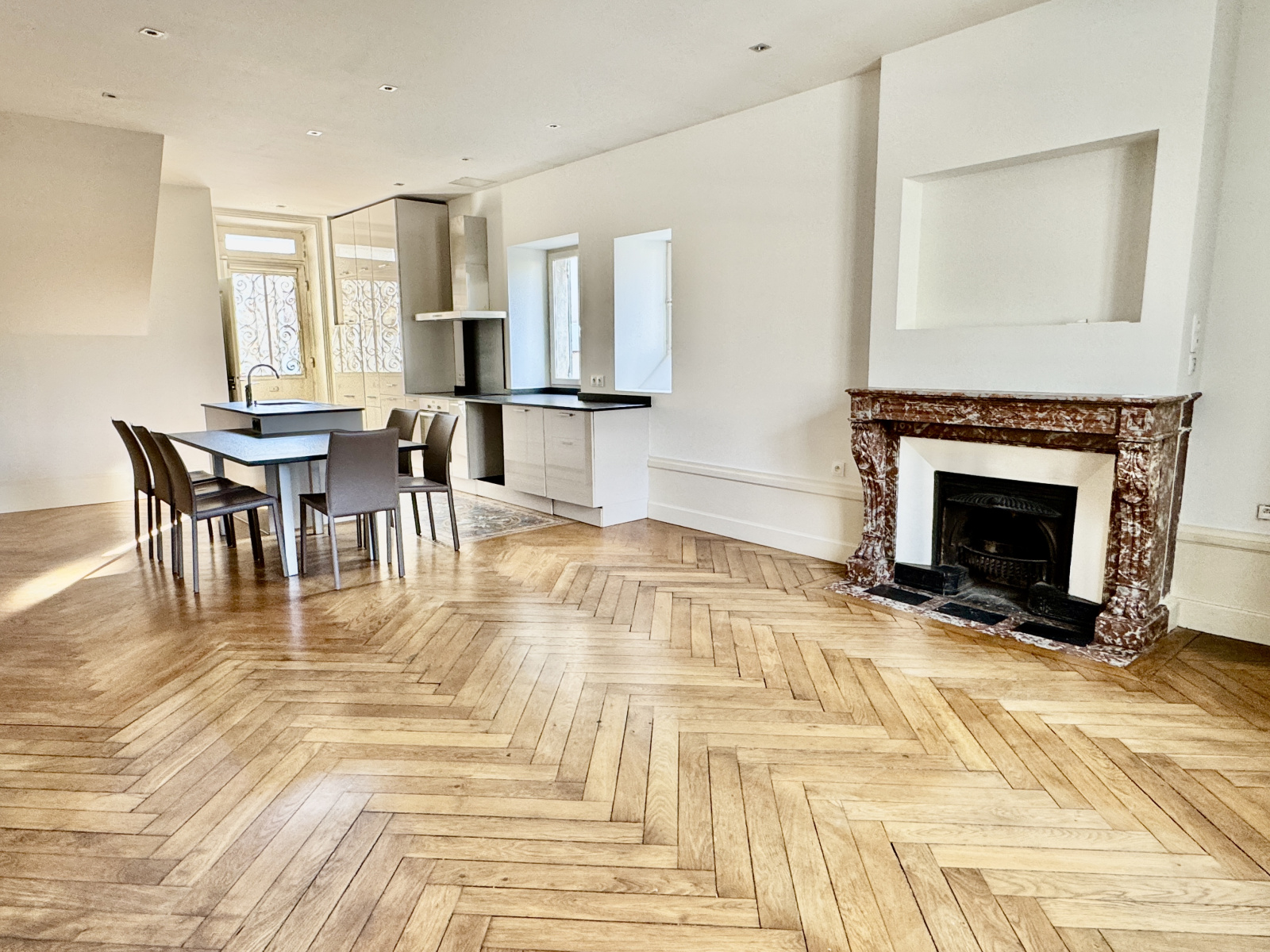 Une grande pièce à vivre de plus de 40m2 comprenant une cuisine ouverte et équipée donnant sur le salon, 2 chambres, une salle d’eau et des toilettes séparées.
