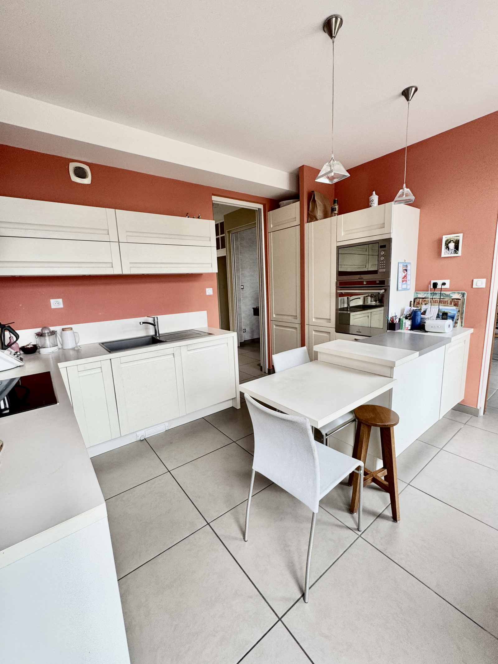 Rez-de-chaussée : cuisine équipée avec terrasse, salon lumineux, salle à manger, chambre avec salle d’eau privative