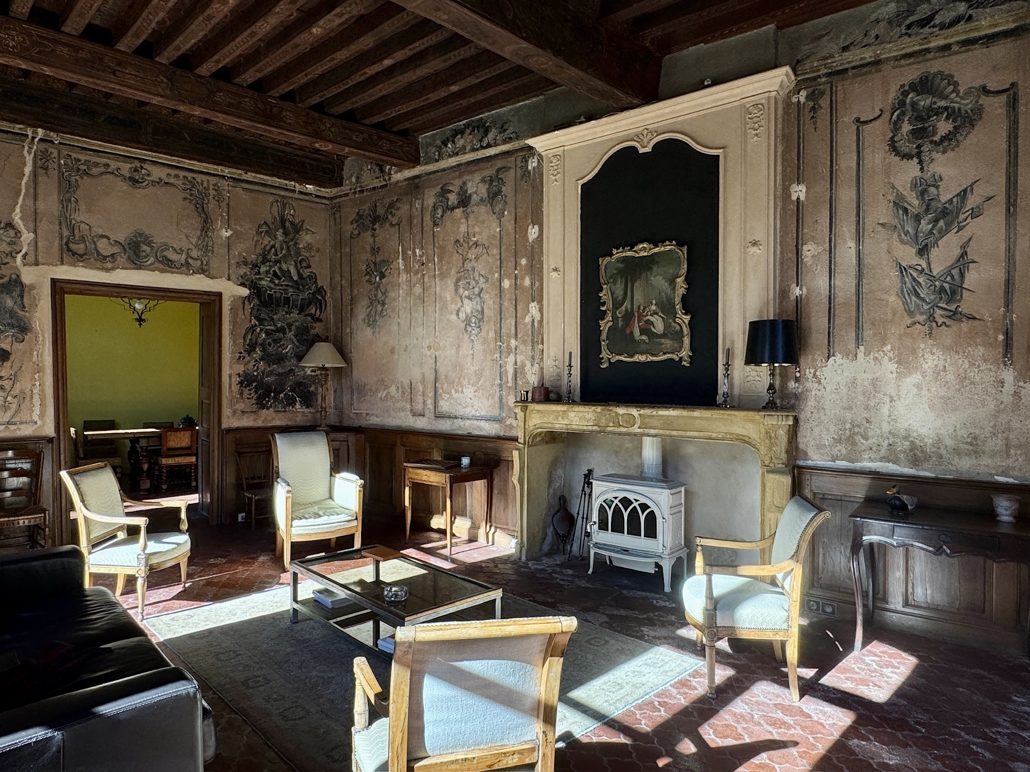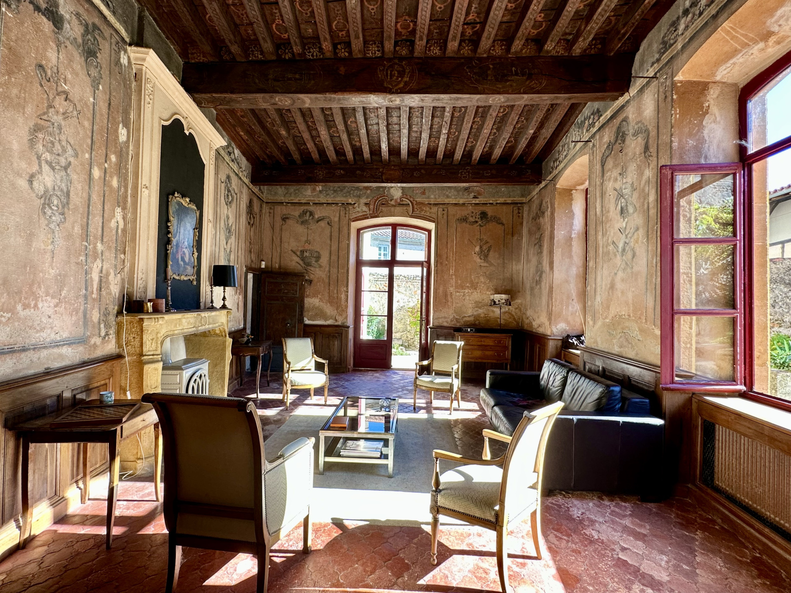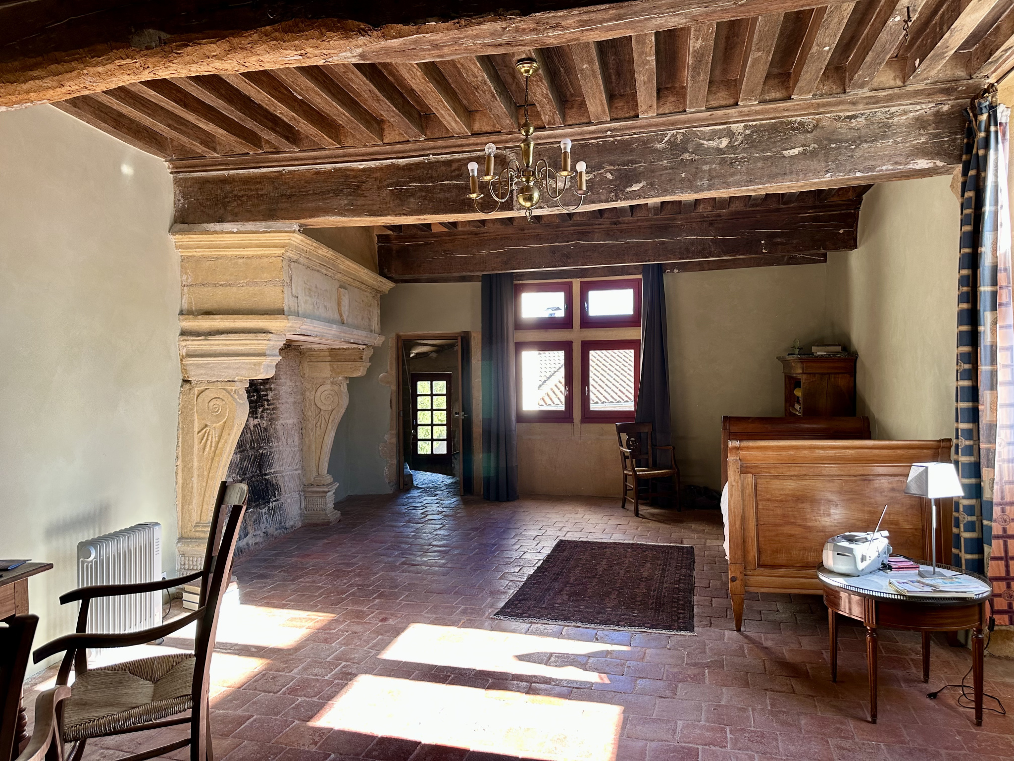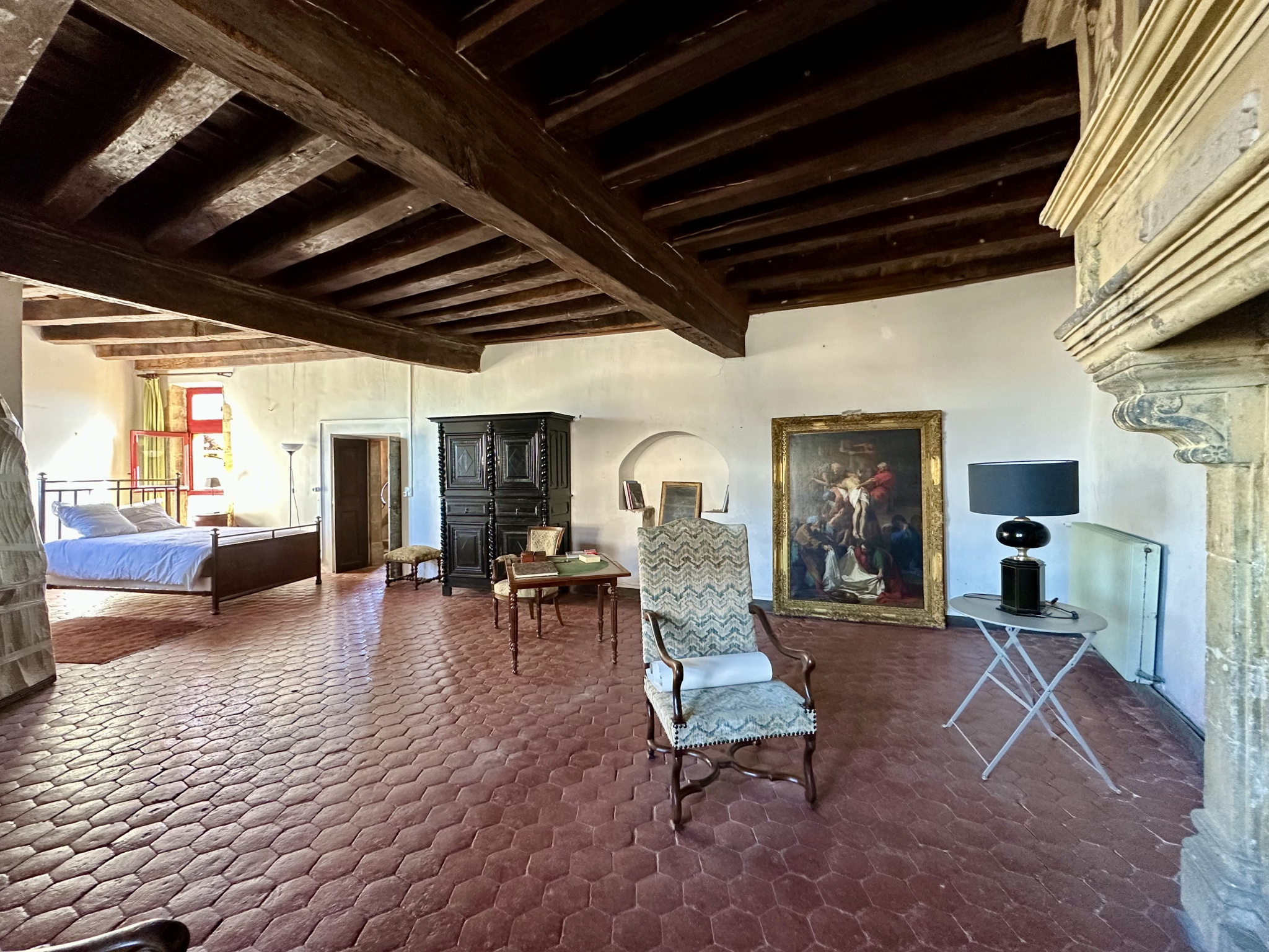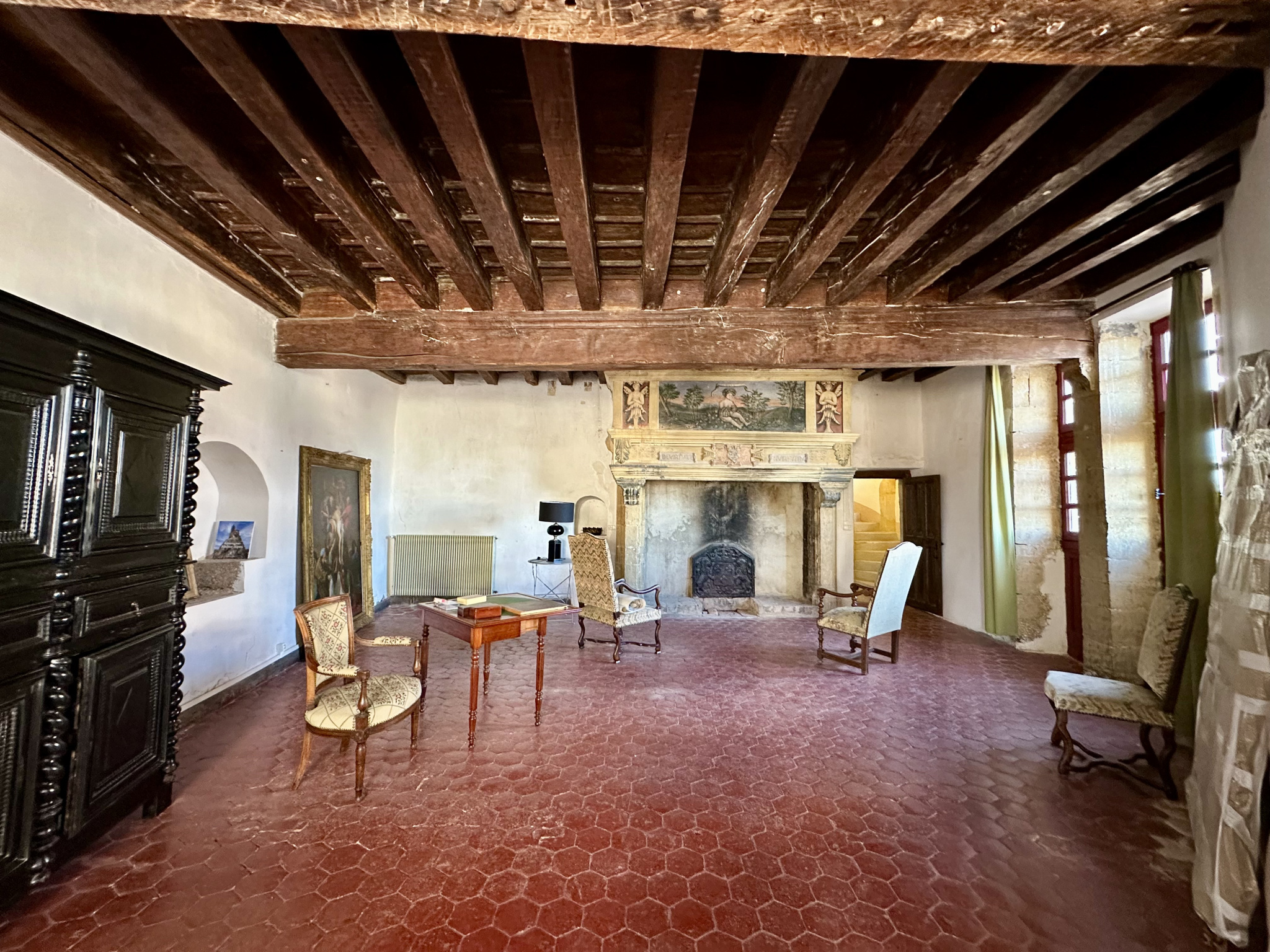 À l’étage, une grande chambre avec cheminée classée et trumeau peint, deux chambres supplémentaires, un bureau avec cheminée, une salle d’eau. Sols en tomettes, peintures murales, éléments décoratifs d’origine. Les combles, partiellement aménagés, offrent une chambre et un espace à exploiter. Accès au pigeonnier par escalier en vis en pierre.