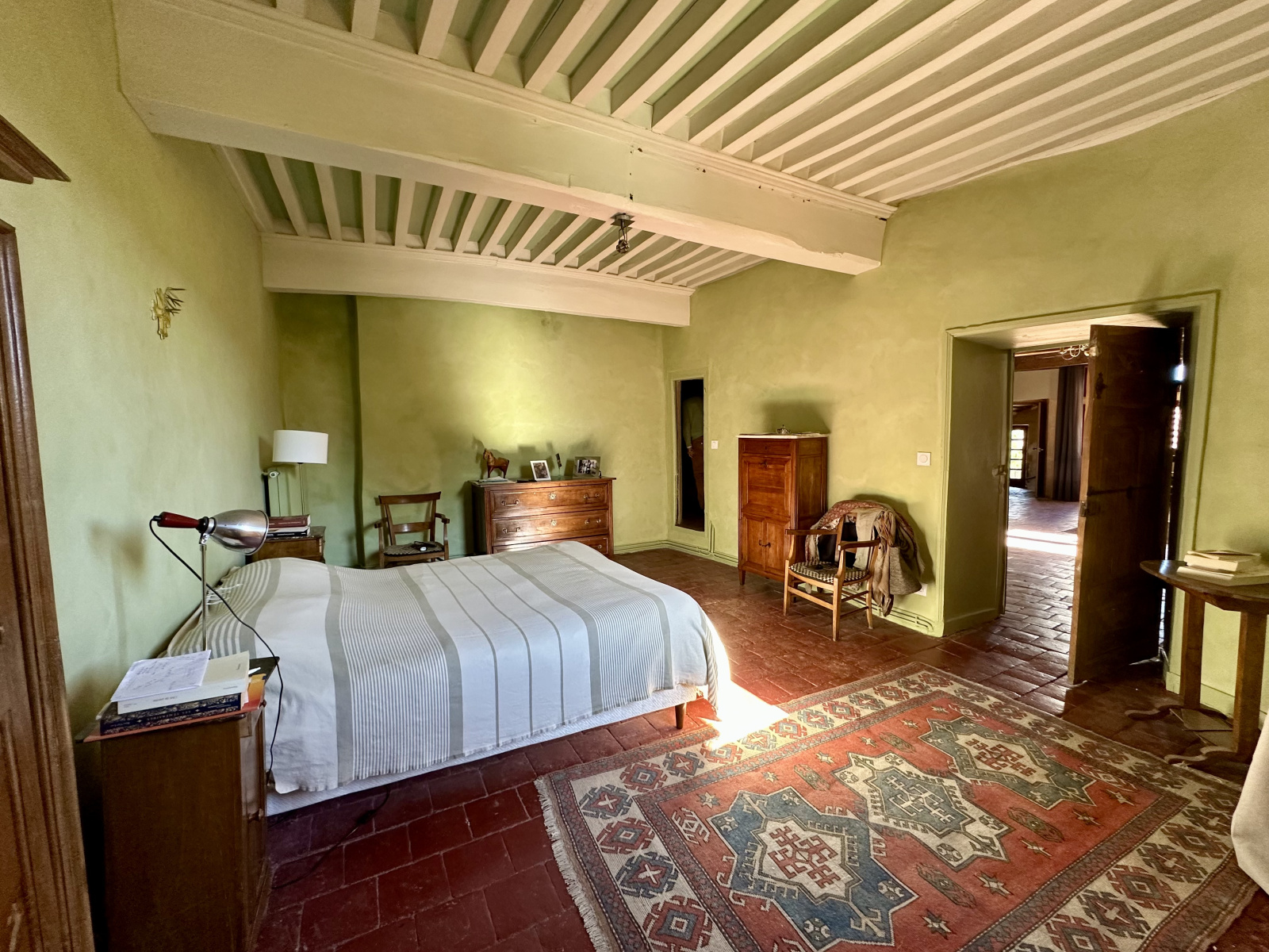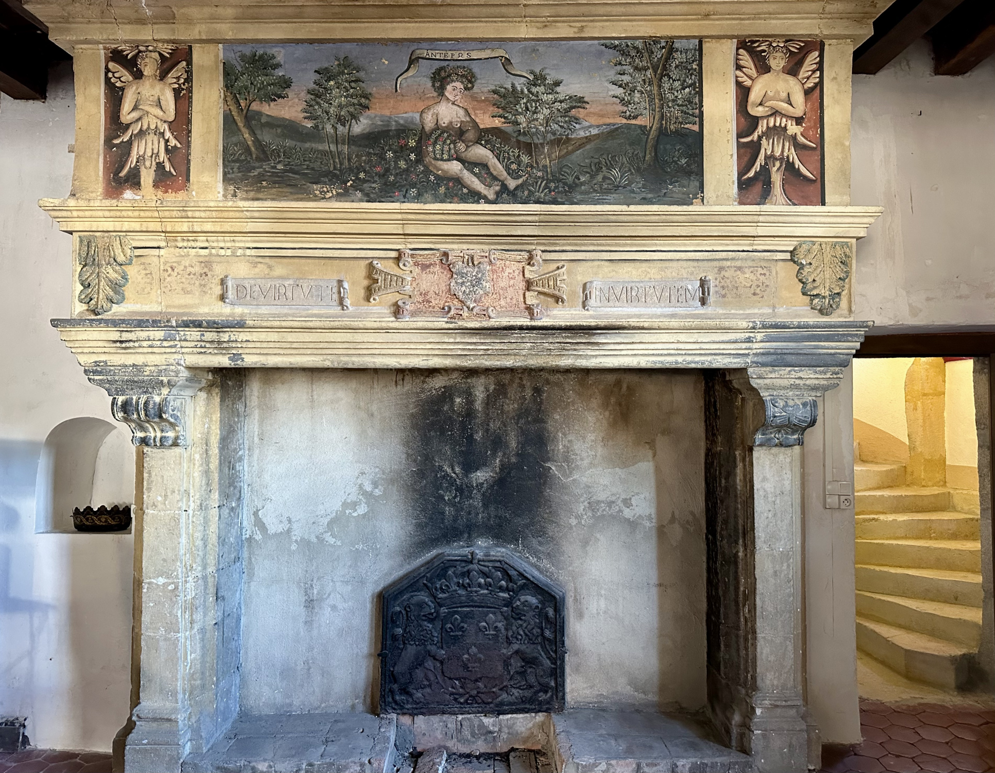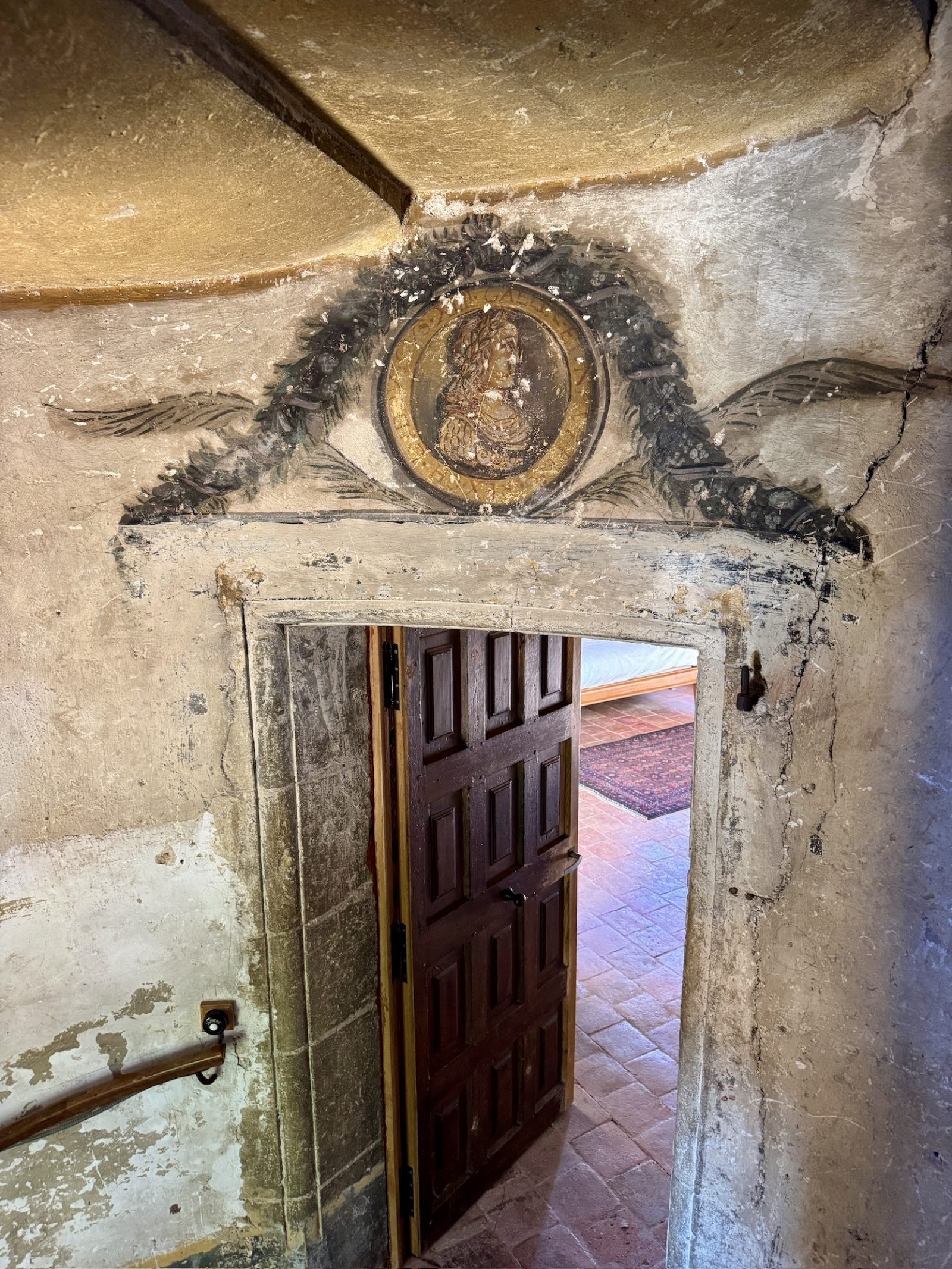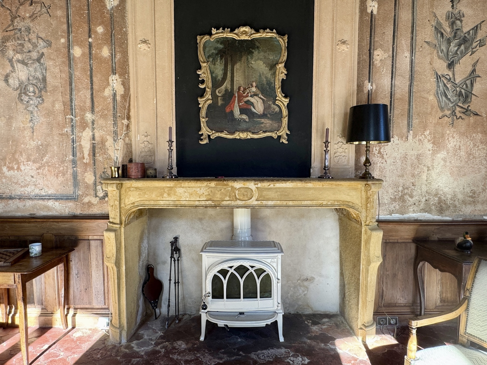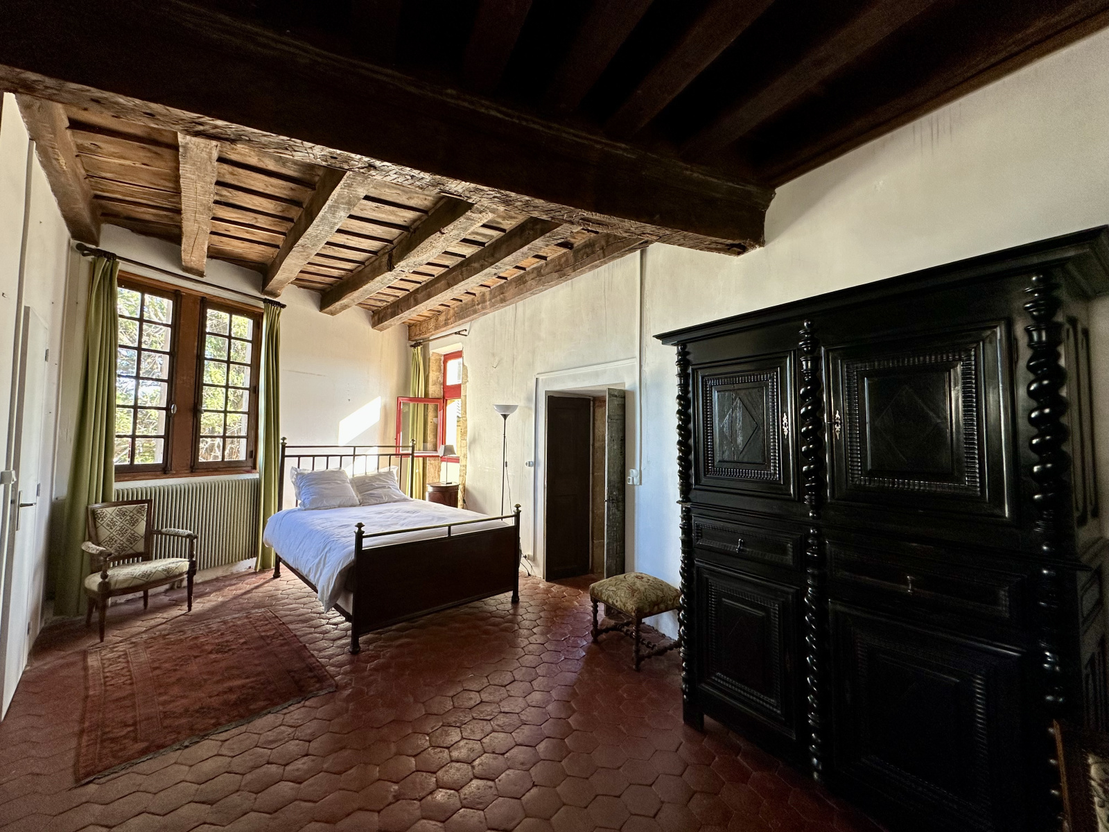 À l’étage, une grande chambre avec cheminée classée et trumeau peint, deux chambres supplémentaires, un bureau avec cheminée, une salle d’eau. Sols en tomettes, peintures murales, éléments décoratifs d’origine. Les combles, partiellement aménagés, offrent une chambre et un espace à exploiter. Accès au pigeonnier par escalier en vis en pierre.