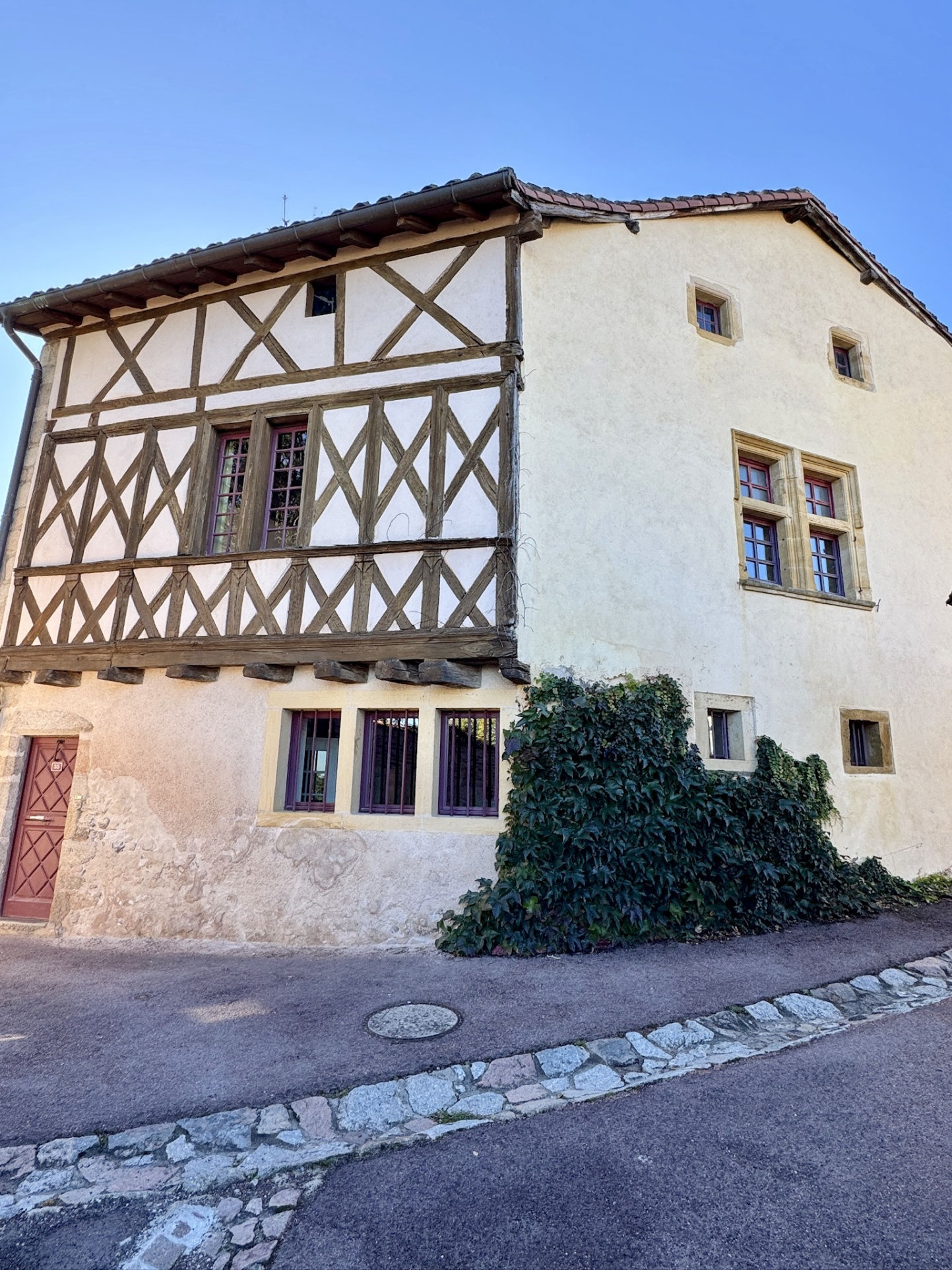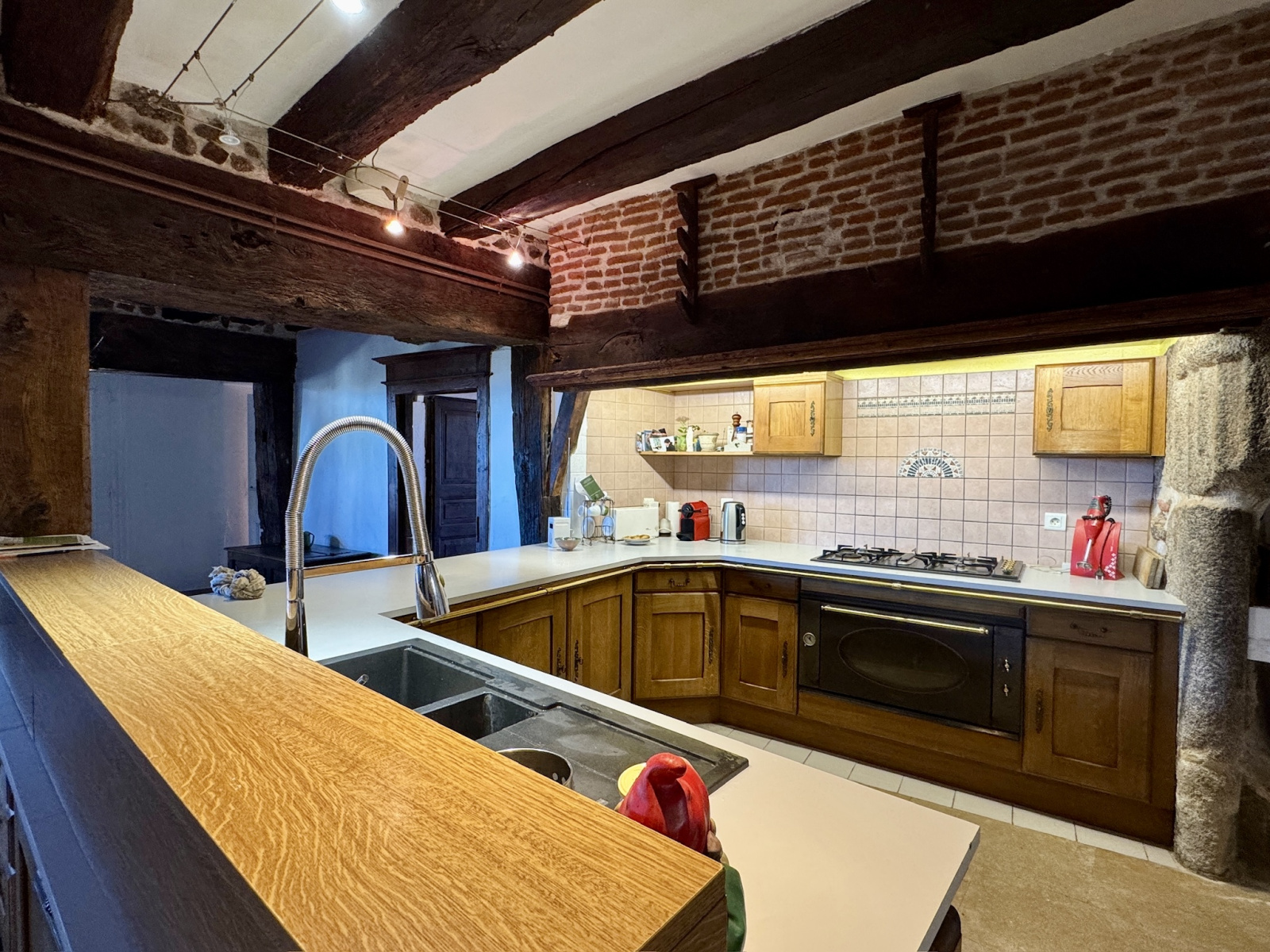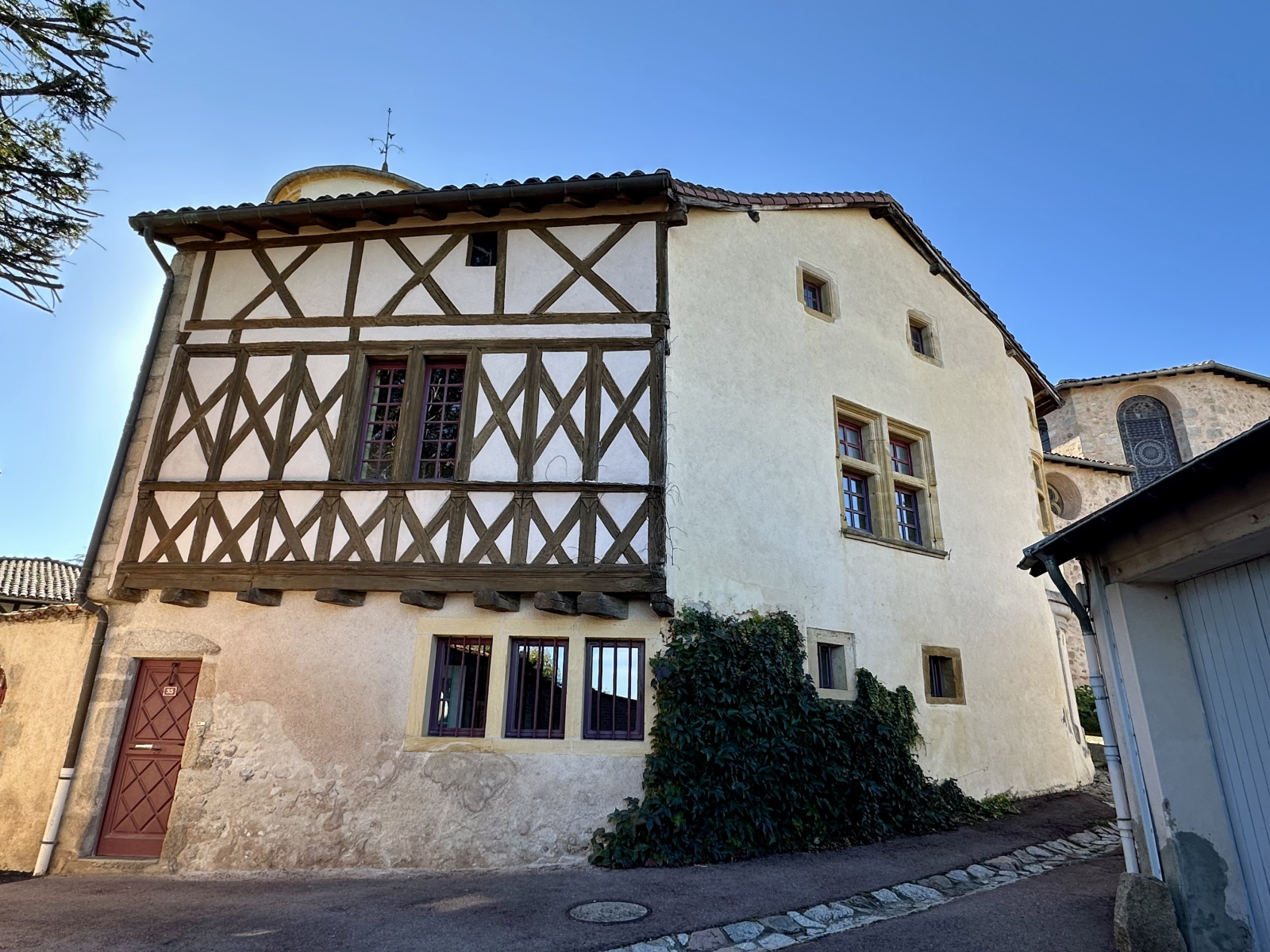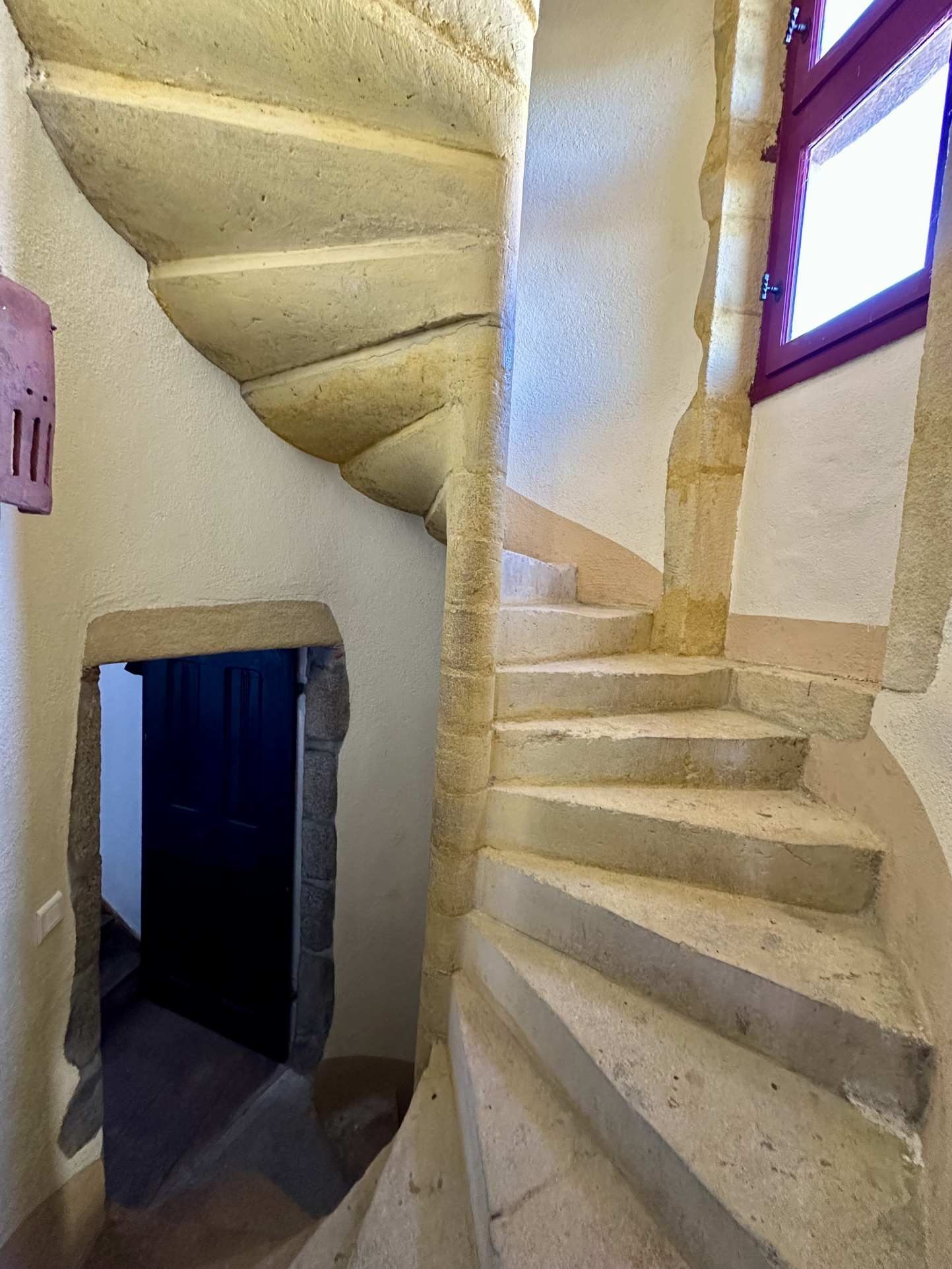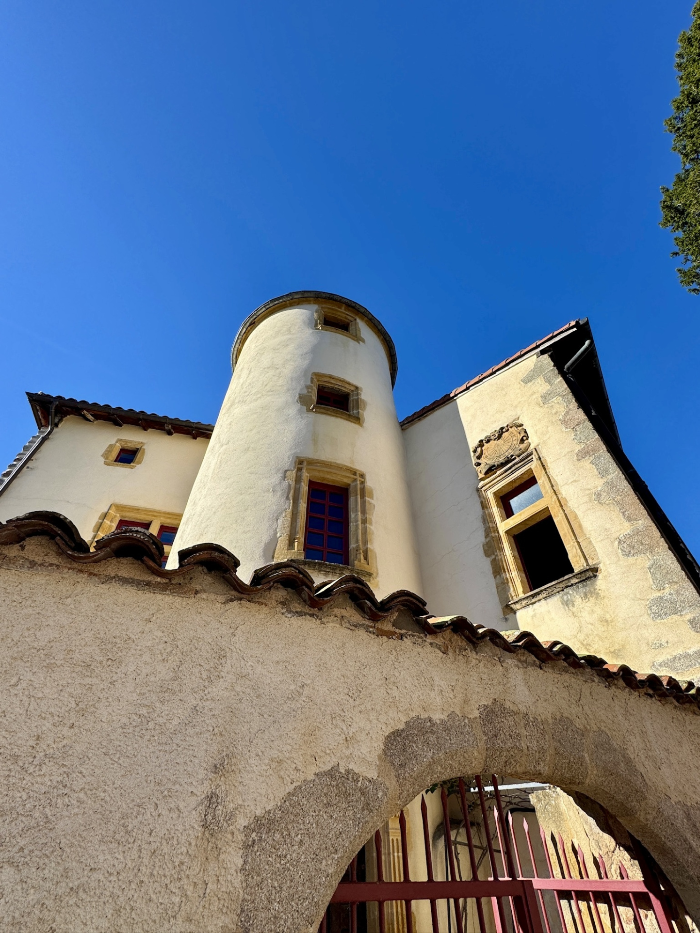 La maison principale, d’environ 200 m² habitables, offre un cadre de vie chargé d’histoire : façades en pierre, enduits à la chaux, pans de bois, fenêtres à meneaux, baies cintrées. La tourelle ronde, surmontée de son pigeonnier, offre un point de vue à 360° sur le village et la campagne environnante.