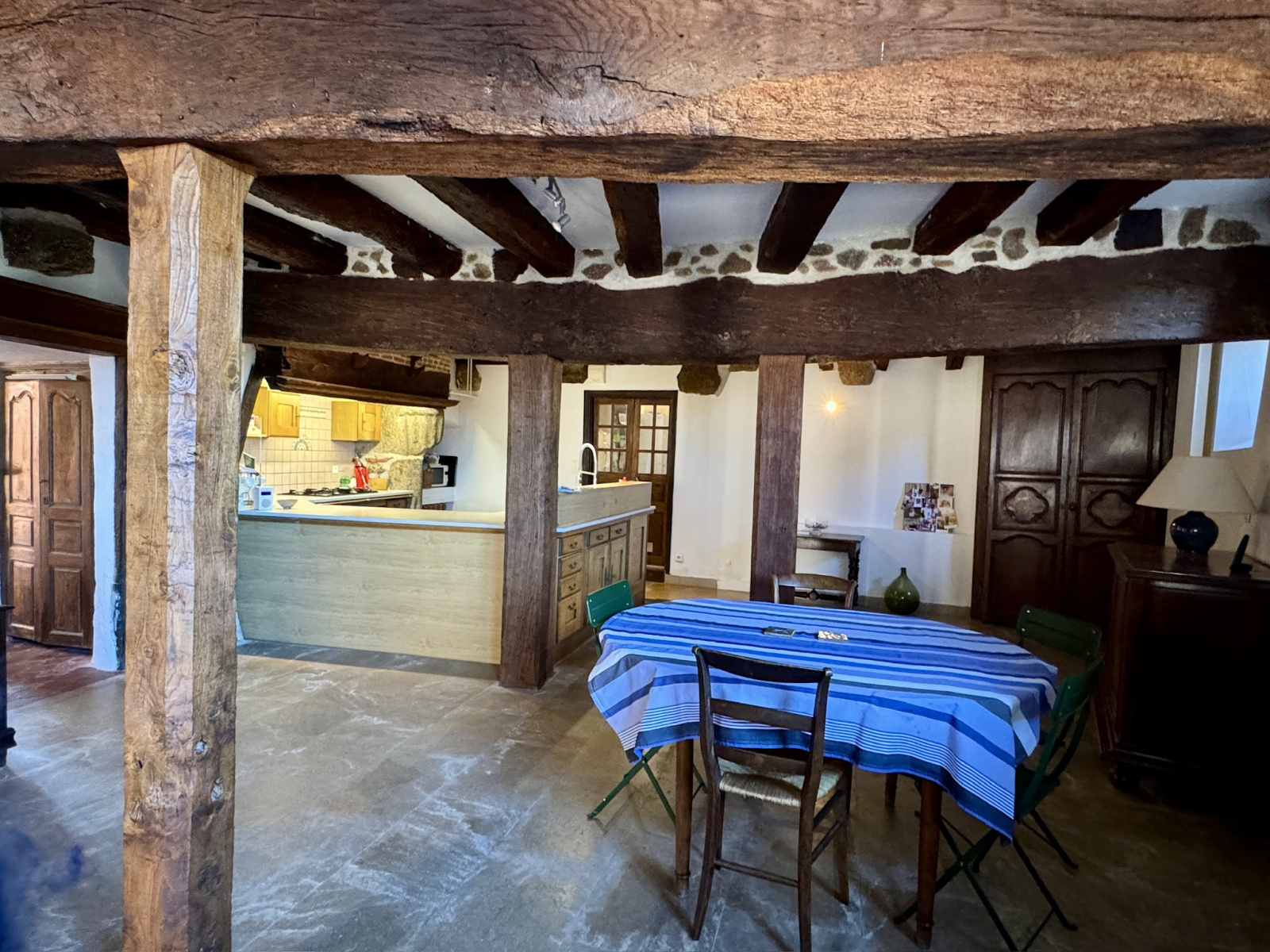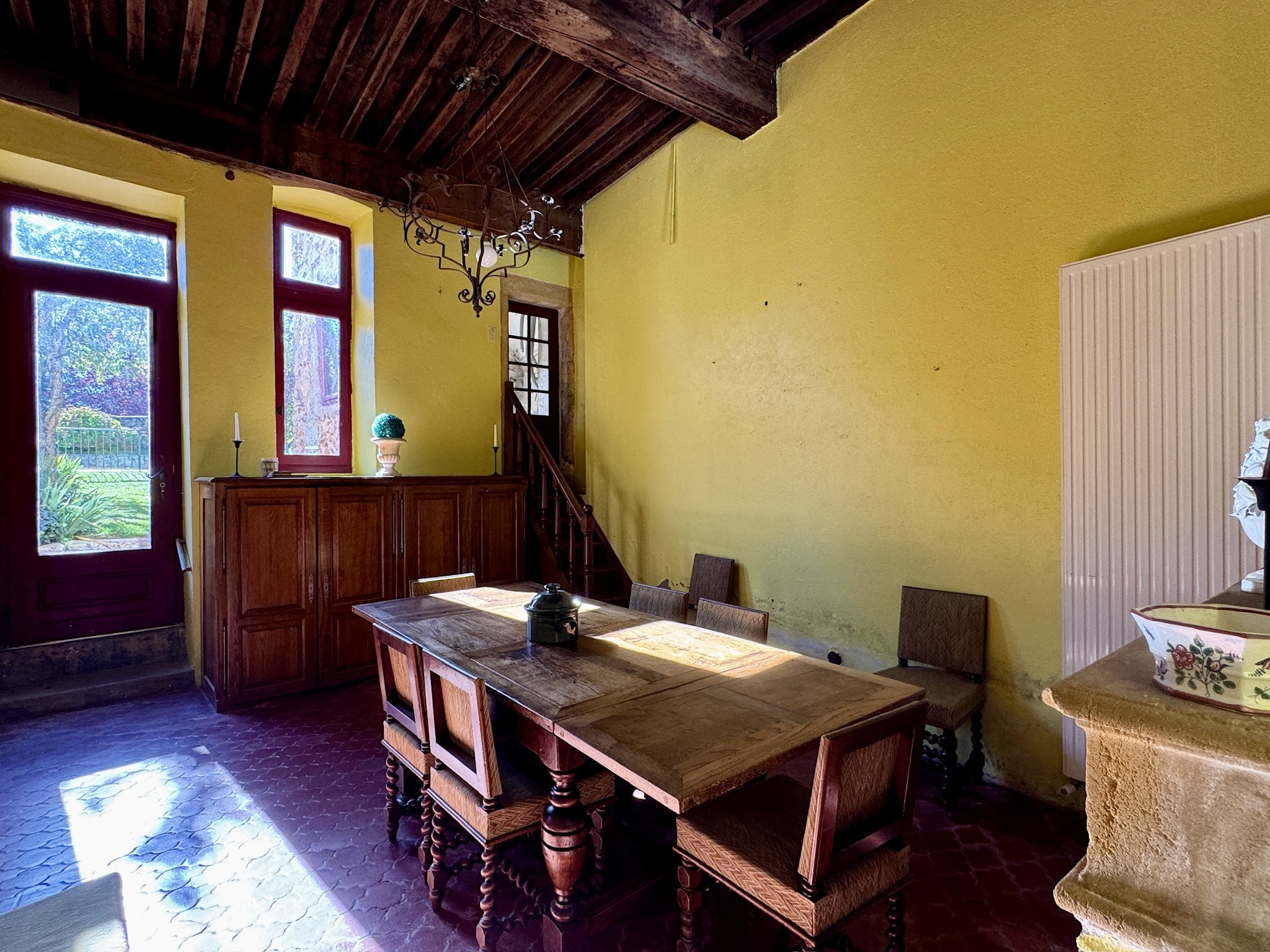 Le rez-de-chaussée comprend un salon lumineux orné de fresques anciennes, une cheminée en pierre de Bourgogne avec poêle à bois, une salle à manger ouvrant sur le jardin, une cuisine traditionnelle sous poutres, une pièce technique pour la piscine, une chaufferie, une salle d’eau et des WC.