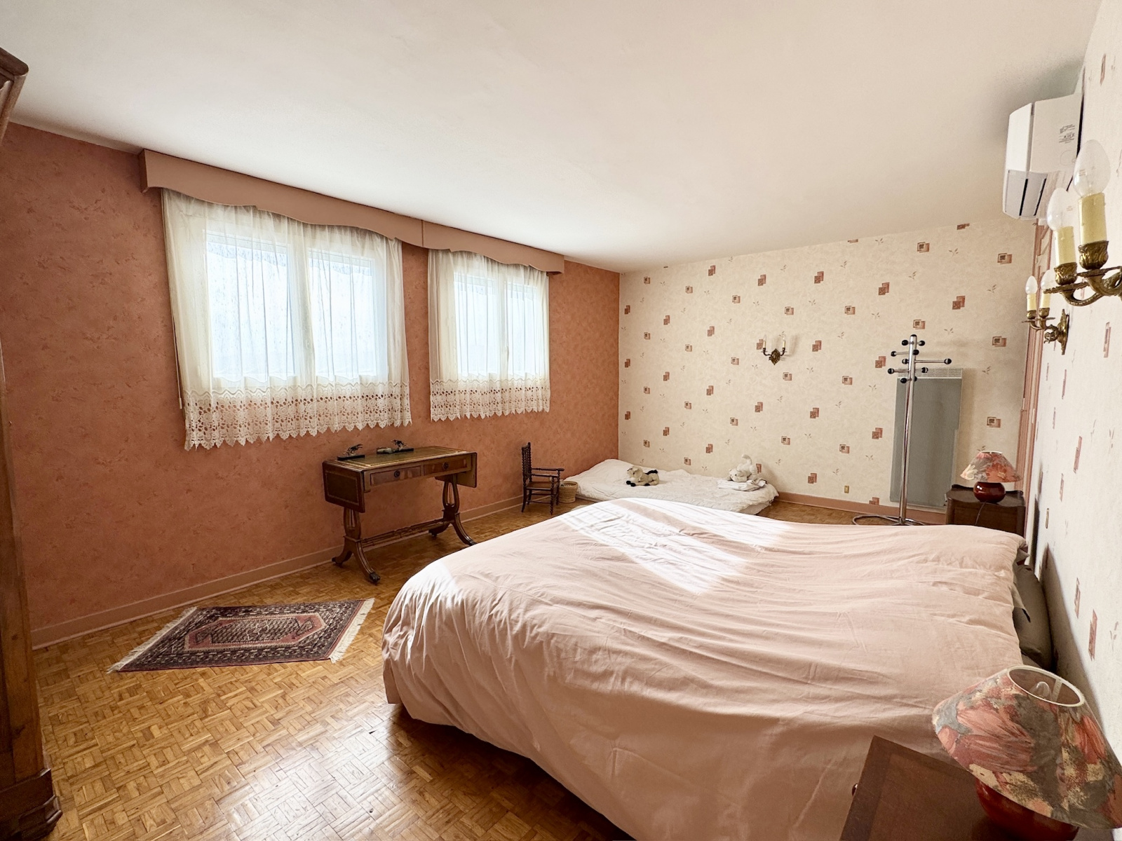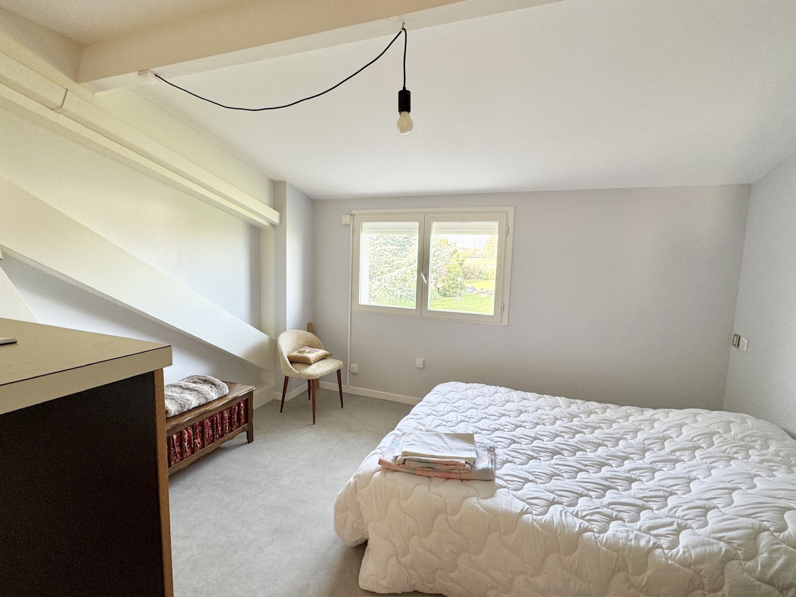 L’étage propose trois chambres climatisées, une salle d’eau et de vastes greniers.