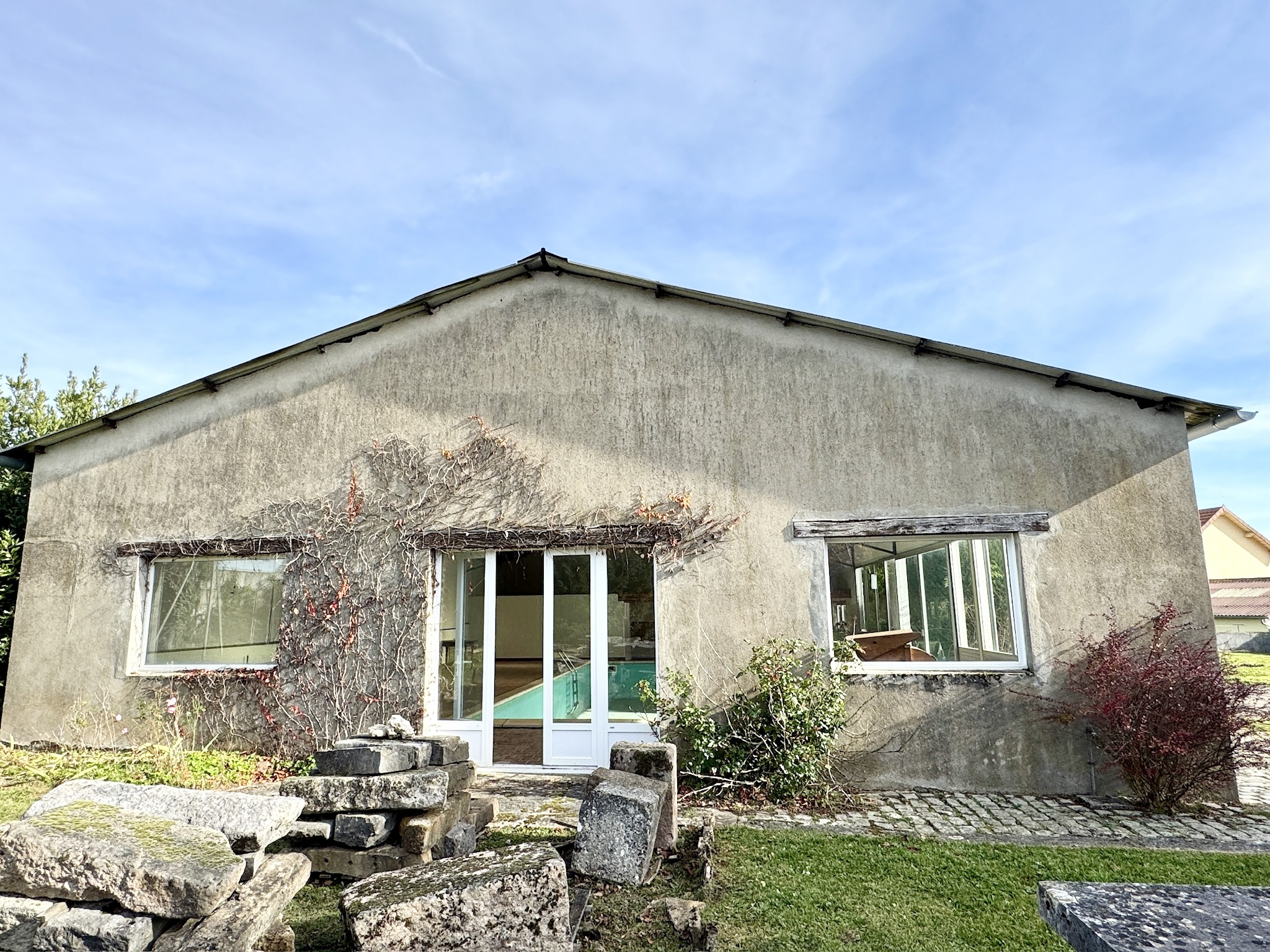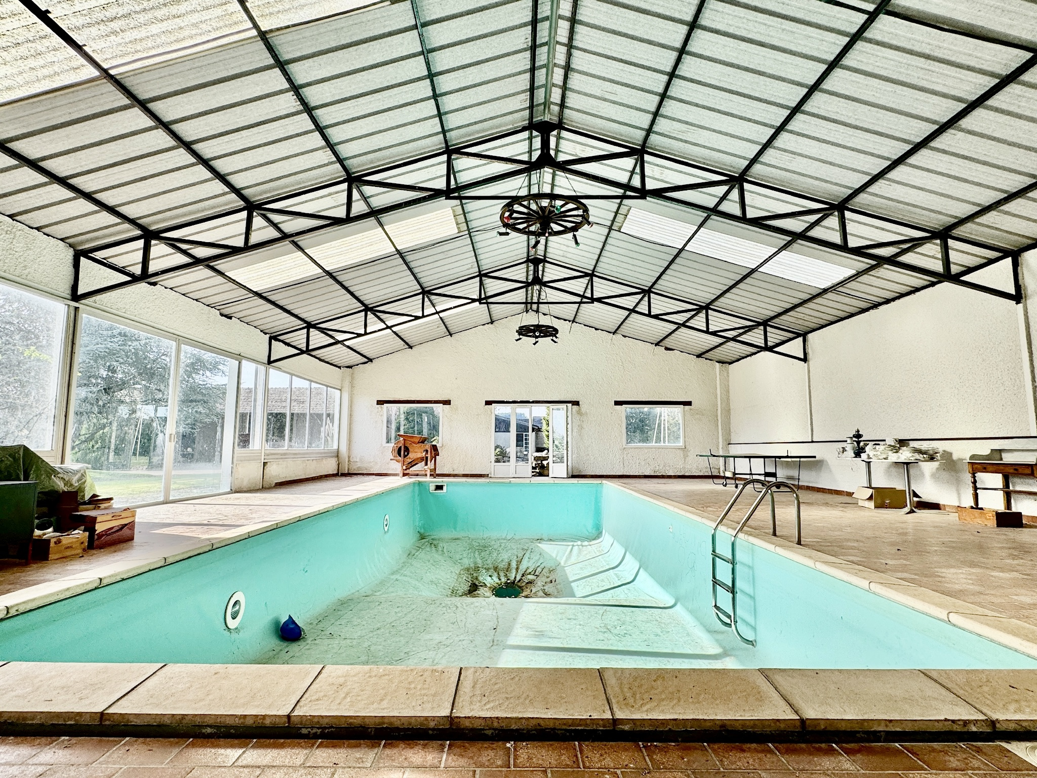 À l’extérieur, les dépendances confèrent à la propriété un caractère véritablement unique avec un vaste hangar d’environ 200 m² et un ancien atelier transformé en espace piscine abritant un bassin intérieur de 12 mètres sur 5 et intégrant un espace douche, toilettes et vestiaire.