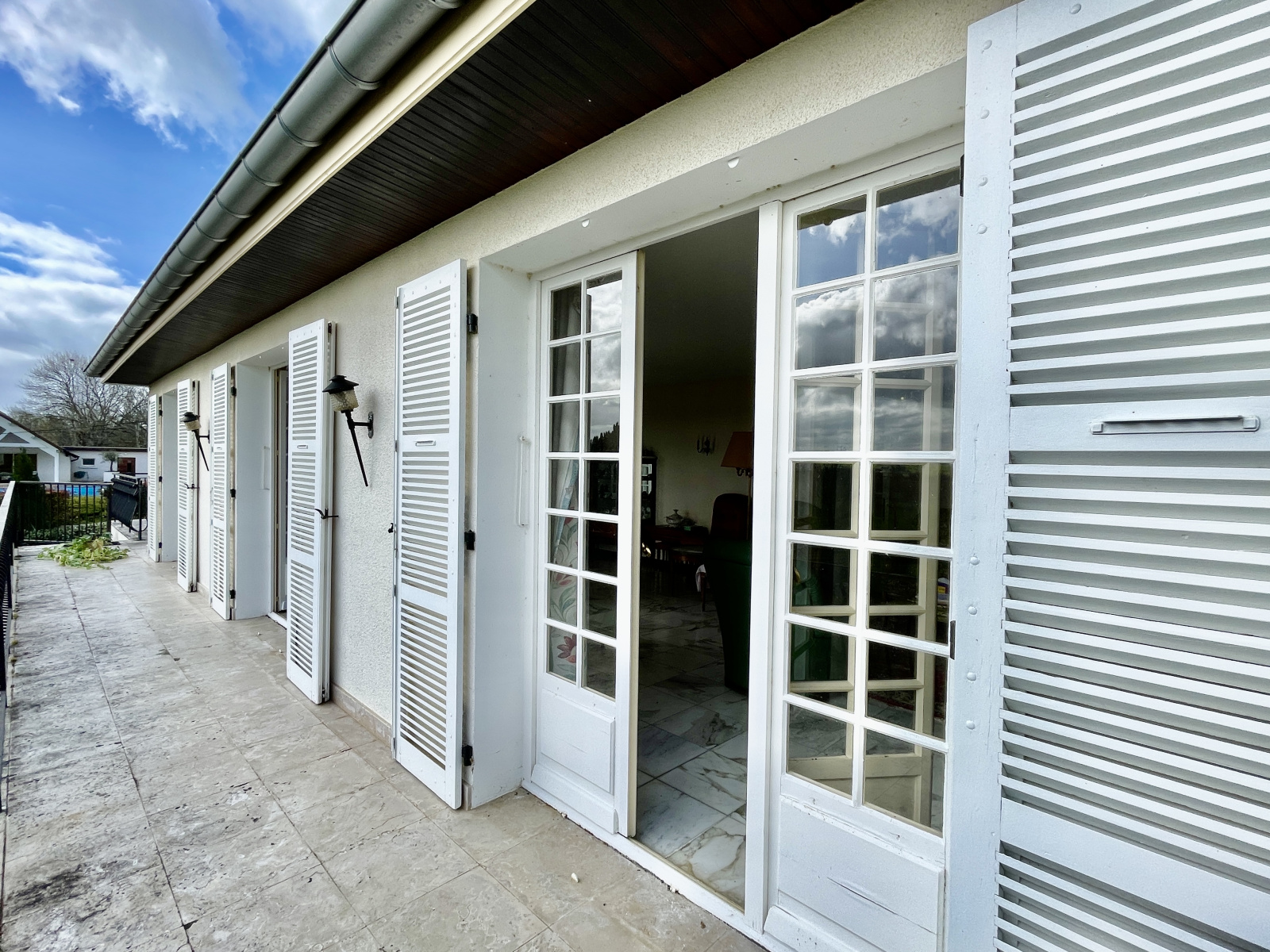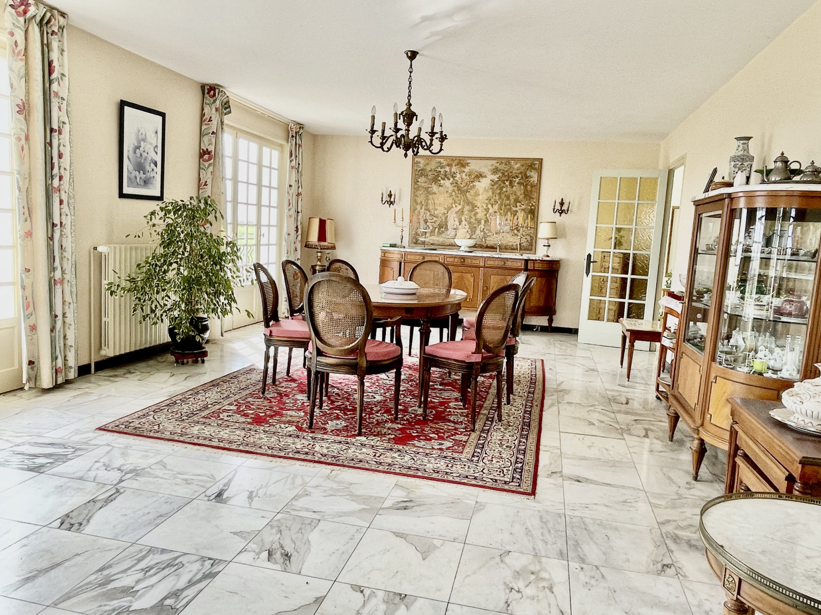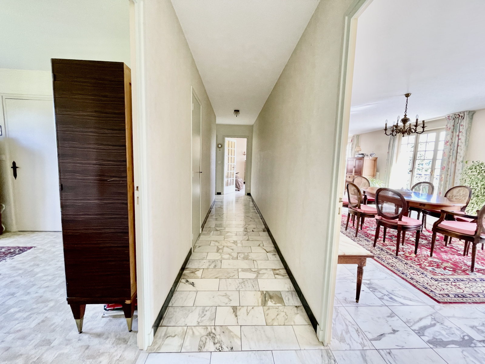 Cette demeure très lumineuse est agencée comme suit: un bel hall d’entrée dessert de part et d’autres: un double séjour de 56 m2 bénéficiant de larges baies vitréesouvrant sur une terrasse, une cuisine séparée et équipée avec accès sur l’extérieur, 4 chambres, une salle d’eau, une salle de bains et des toilettes séparées.