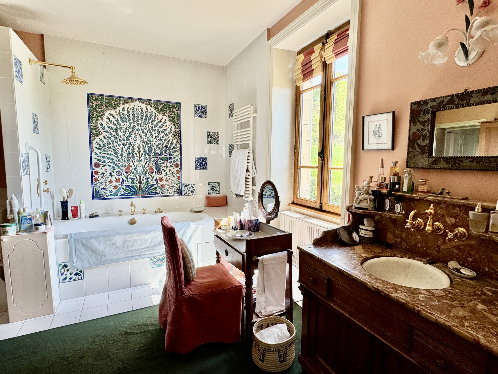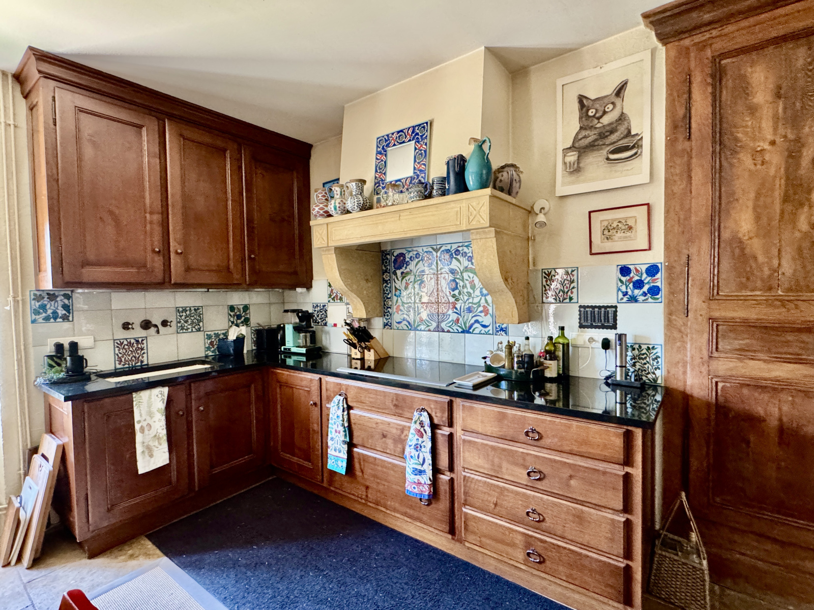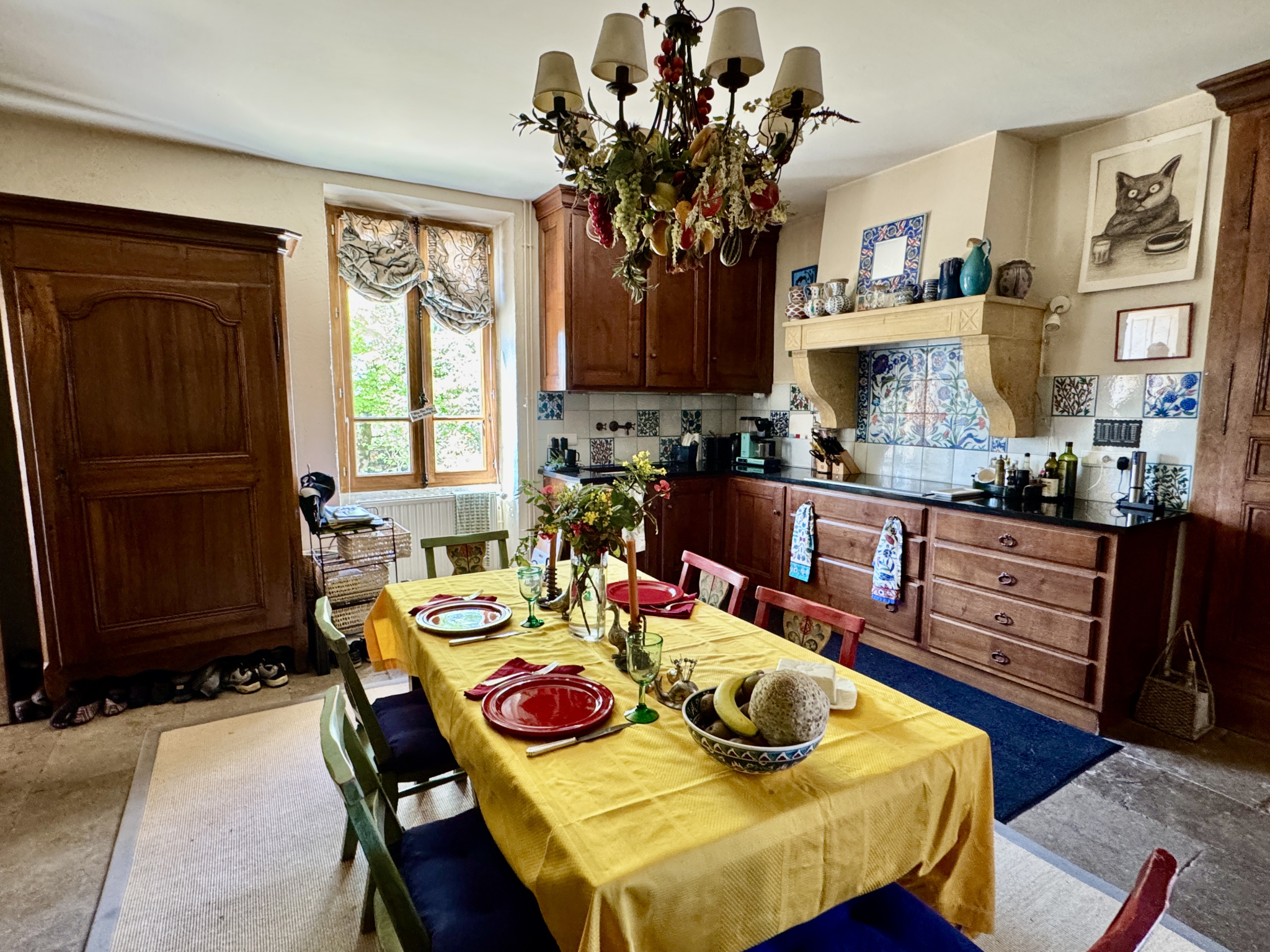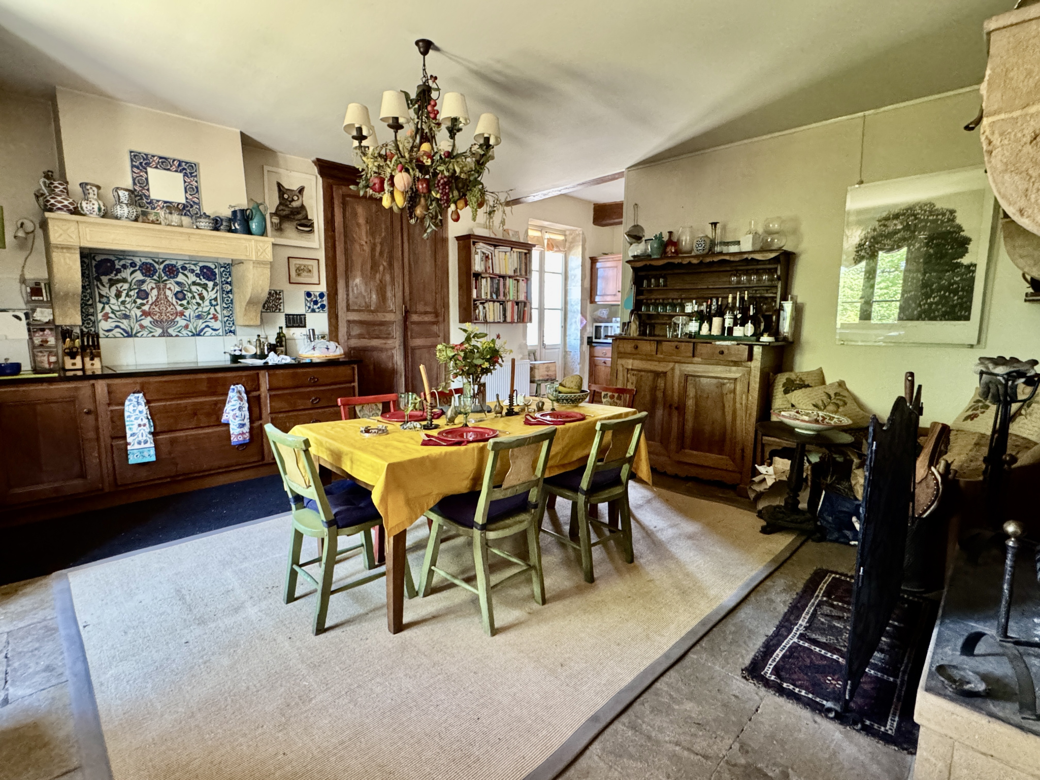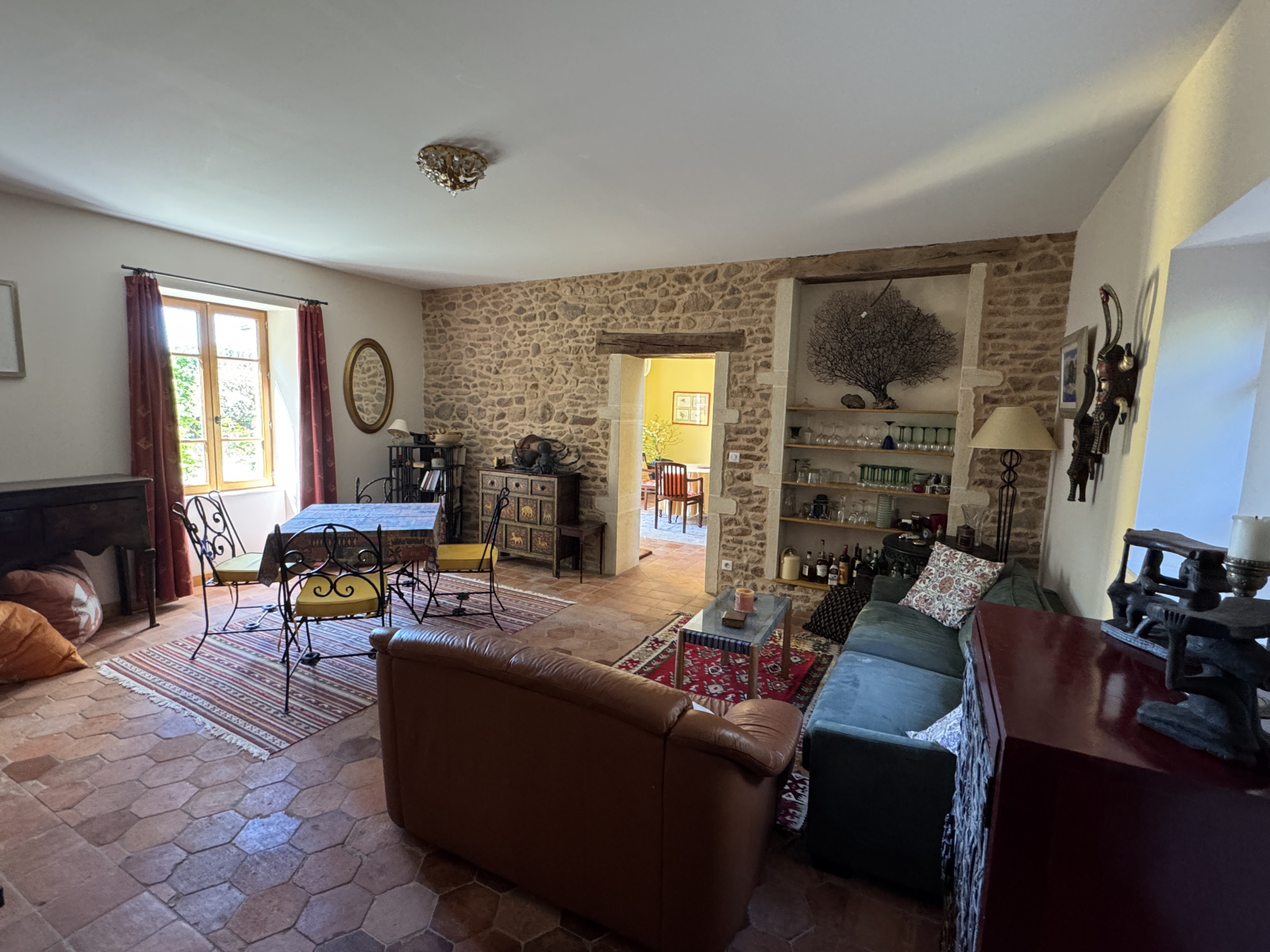 La maison principale, d’environ 320 m² habitables, séduit par ses volumes généreux et son atmosphère chaleureuse. Elle propose au rez-de-jardin une belle cuisine conviviale, un salon, une vaste salle de réception ainsi qu’une buanderie.