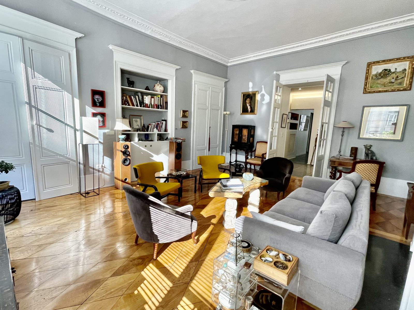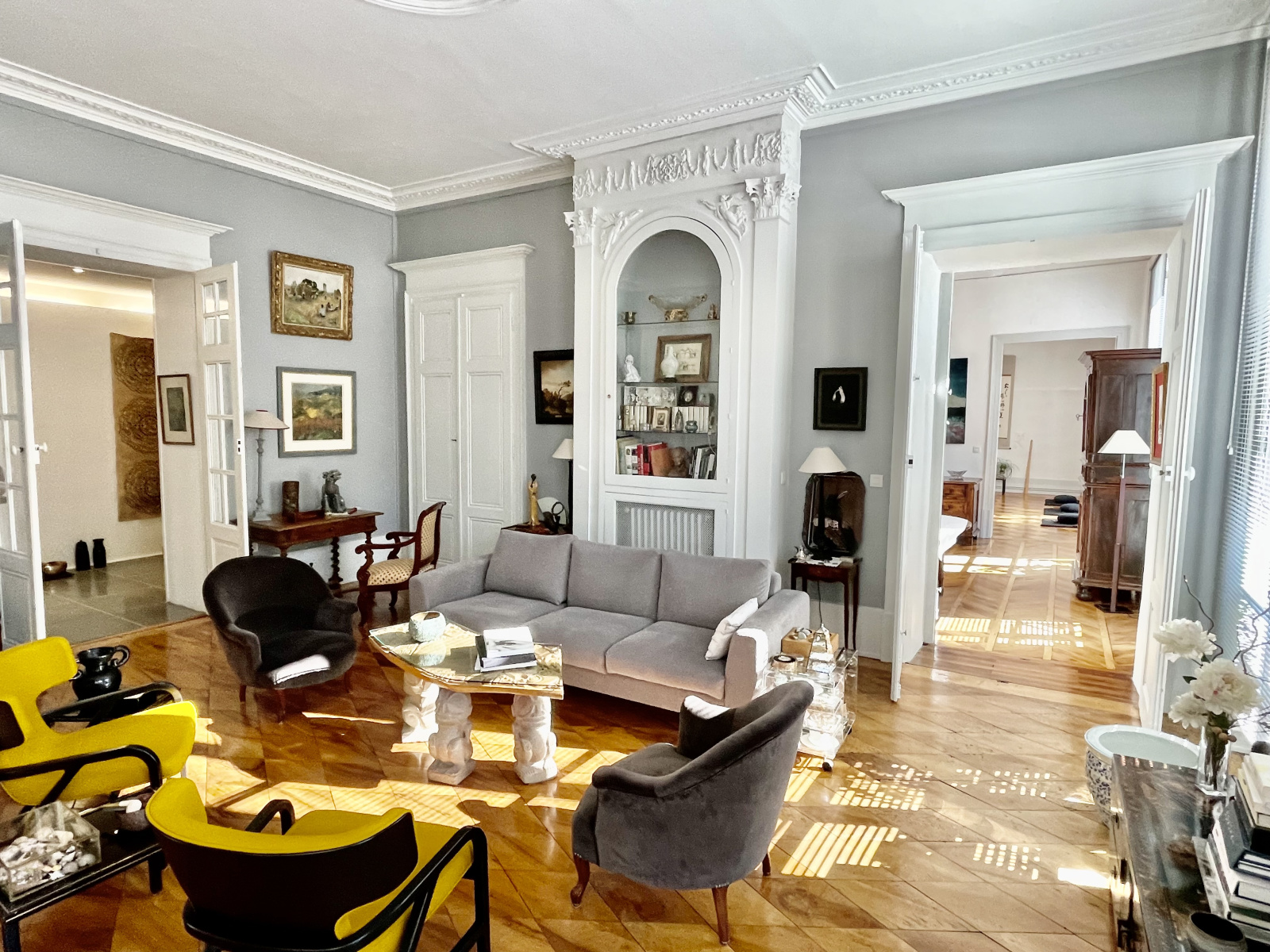 Grenoble (38000)Au coeur du centre ville, dans l'un des quartiers les plus prisés, dans un immeuble de très belle facture avec sa cour classée, superbe appartement de prestige de 205 m2 entièrement rénové avec des prestations haut de gamme et ayant préservé tous les éléments décoratifs de l'ancien (parquet aux multiples essences, moulure, cheminée, fronton, hauteur sous plafond). Lumineux et traversant; Il est agencé comme suit:un vaste hall d'entrée dessert de part et d'autres de très belles pièces de réception, une cuisine entièrement équipée, 5 chambres dont une suite parentale de plus de 30 m2 avec salle d'eau et dressing, un cabinet de toilettes, une salle d'eau, trois toilettes. Porte blindée, interphone… Deux portes palières offrent la possibilité de scinder l'appartement. Une cave et un grenier viennent parfaire cet appartement d'exception.Proche de toutes commodités(tram, bus, commerces, écoles..).Possibilité de louer des places de parking.Emplacement privilégié et bien rare à la vente !