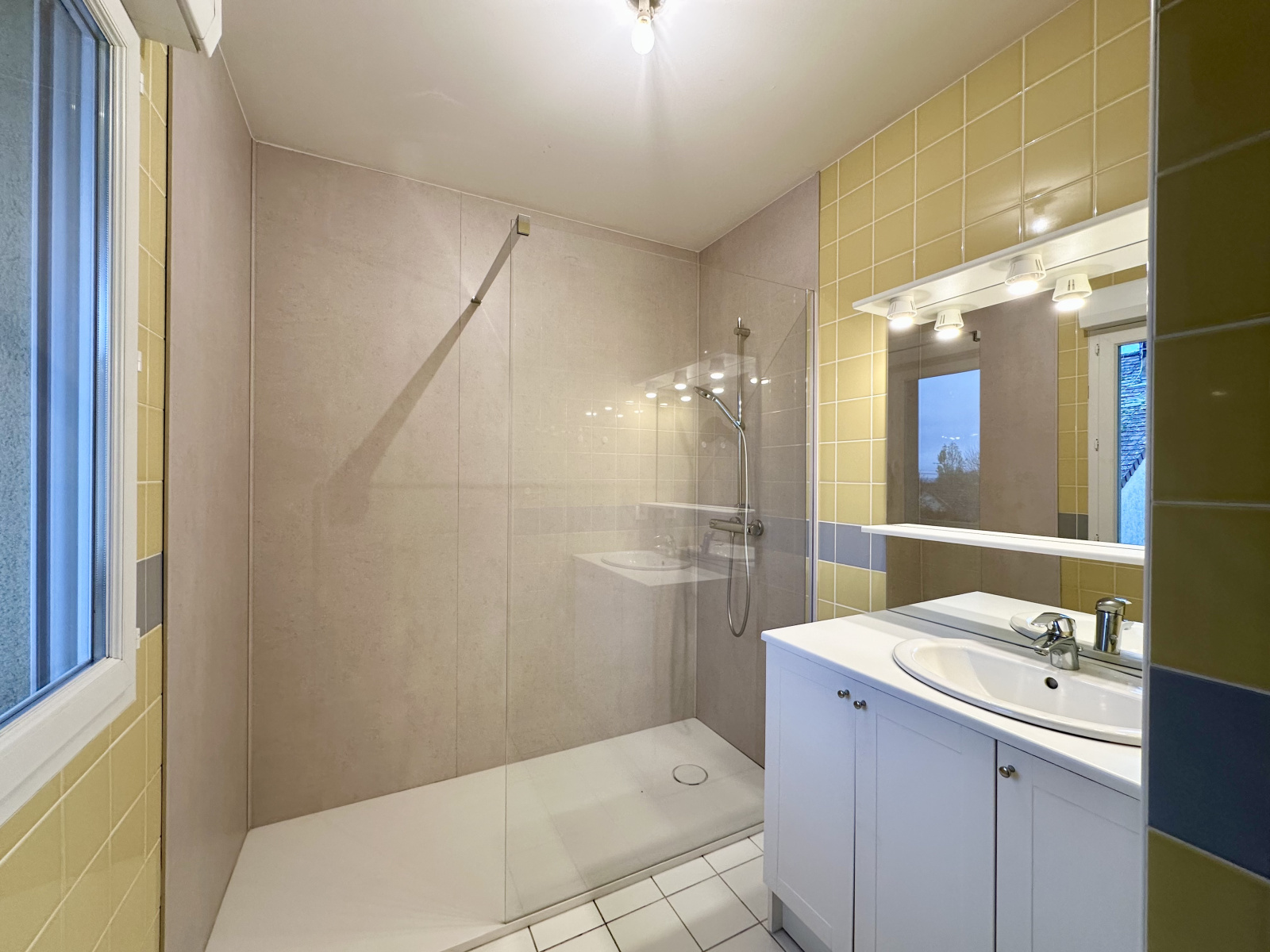 Le rez-de-chaussée se compose d’une entrée, d’un séjour lumineux ouvrant sur le jardin, d’une cuisine meublée et conviviale, ainsi que de toilettes indépendantes. Un garage double avec accès direct à la maison complète cet espace, facilitant le quotidien. Le chauffage au sol, associé à des convecteurs électriques, assure un confort thermique optimal en toutes saisons.