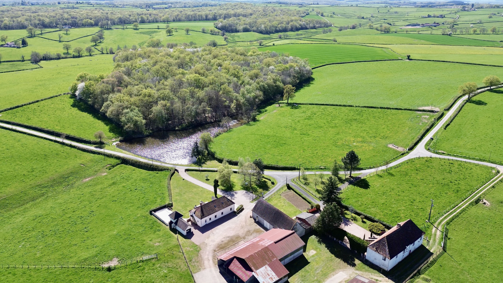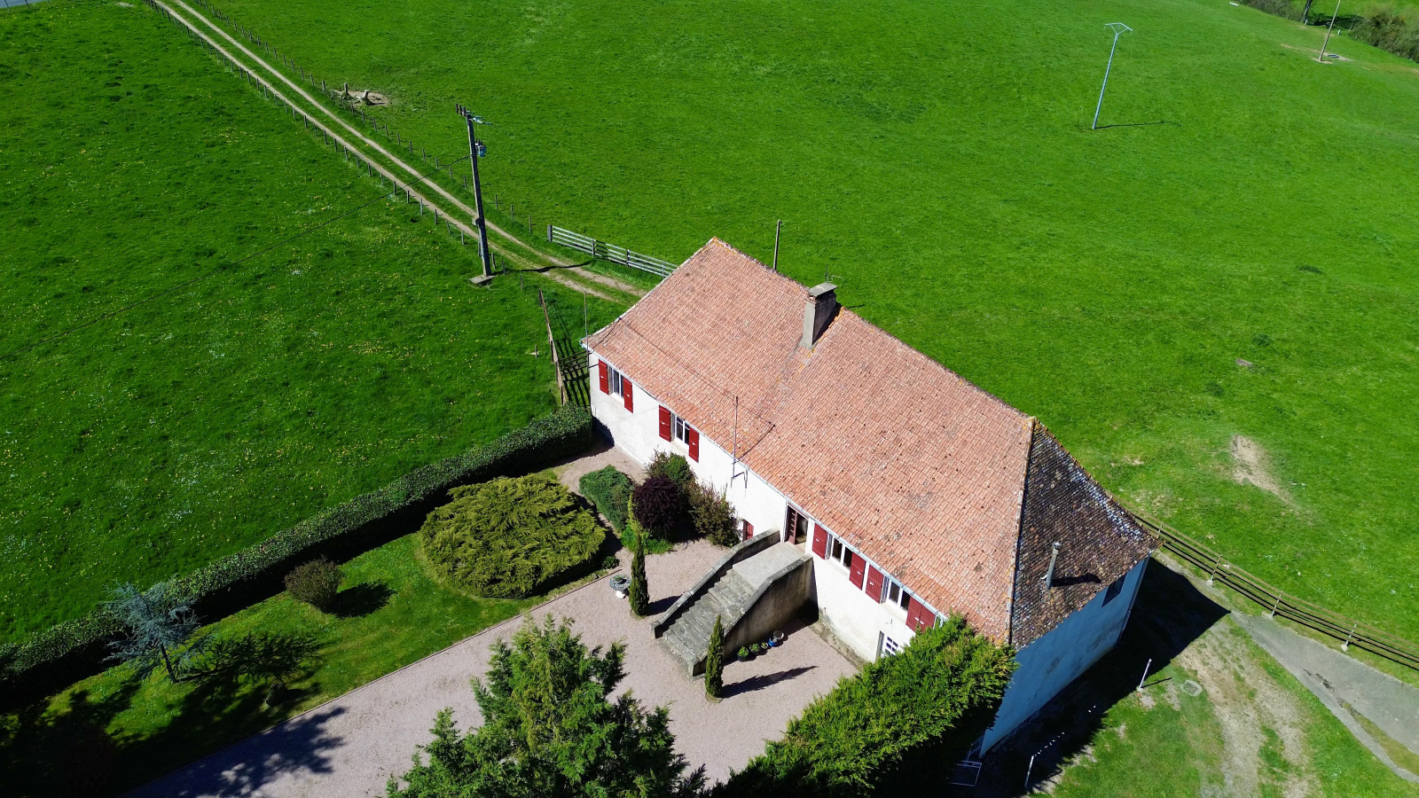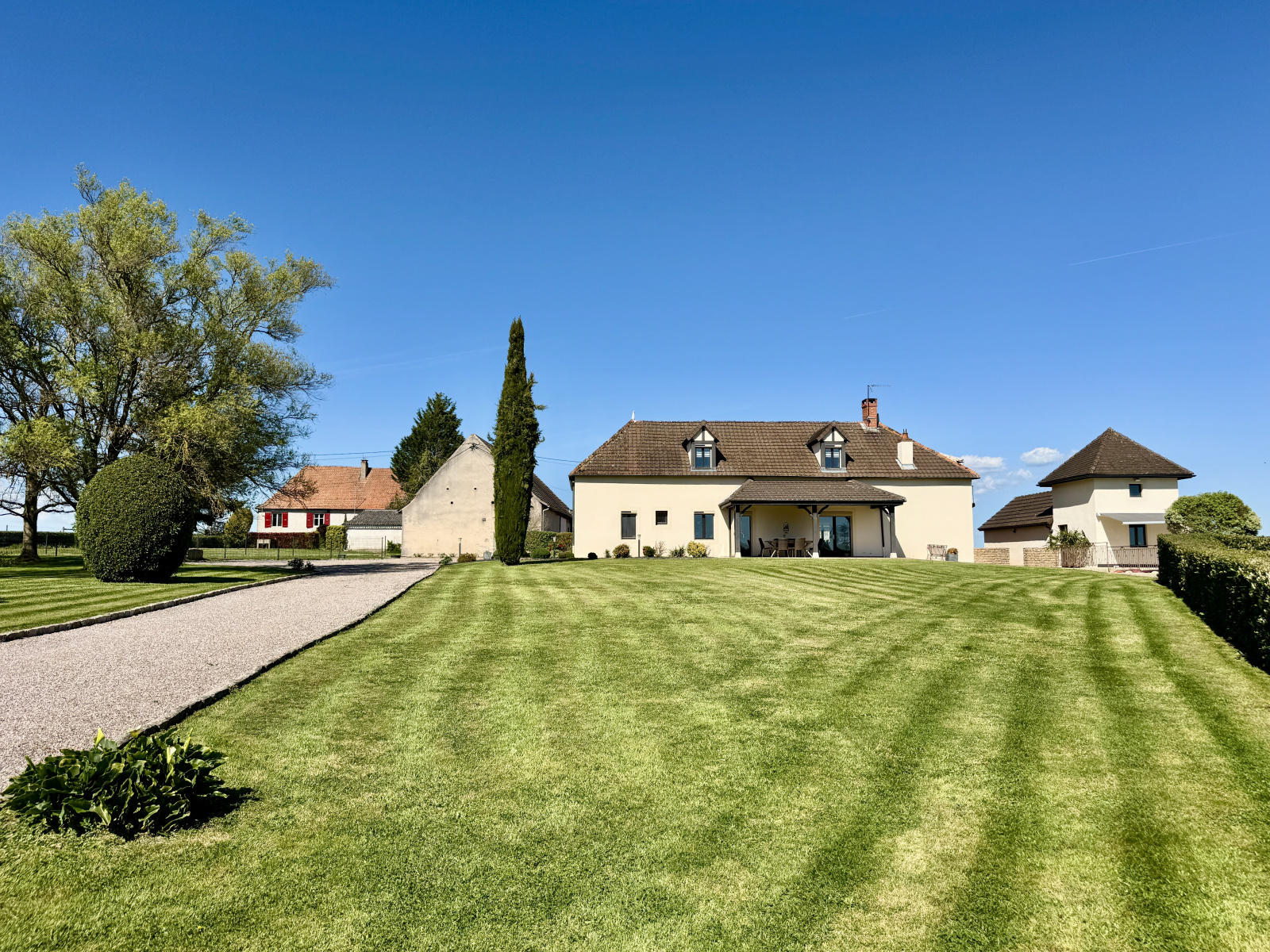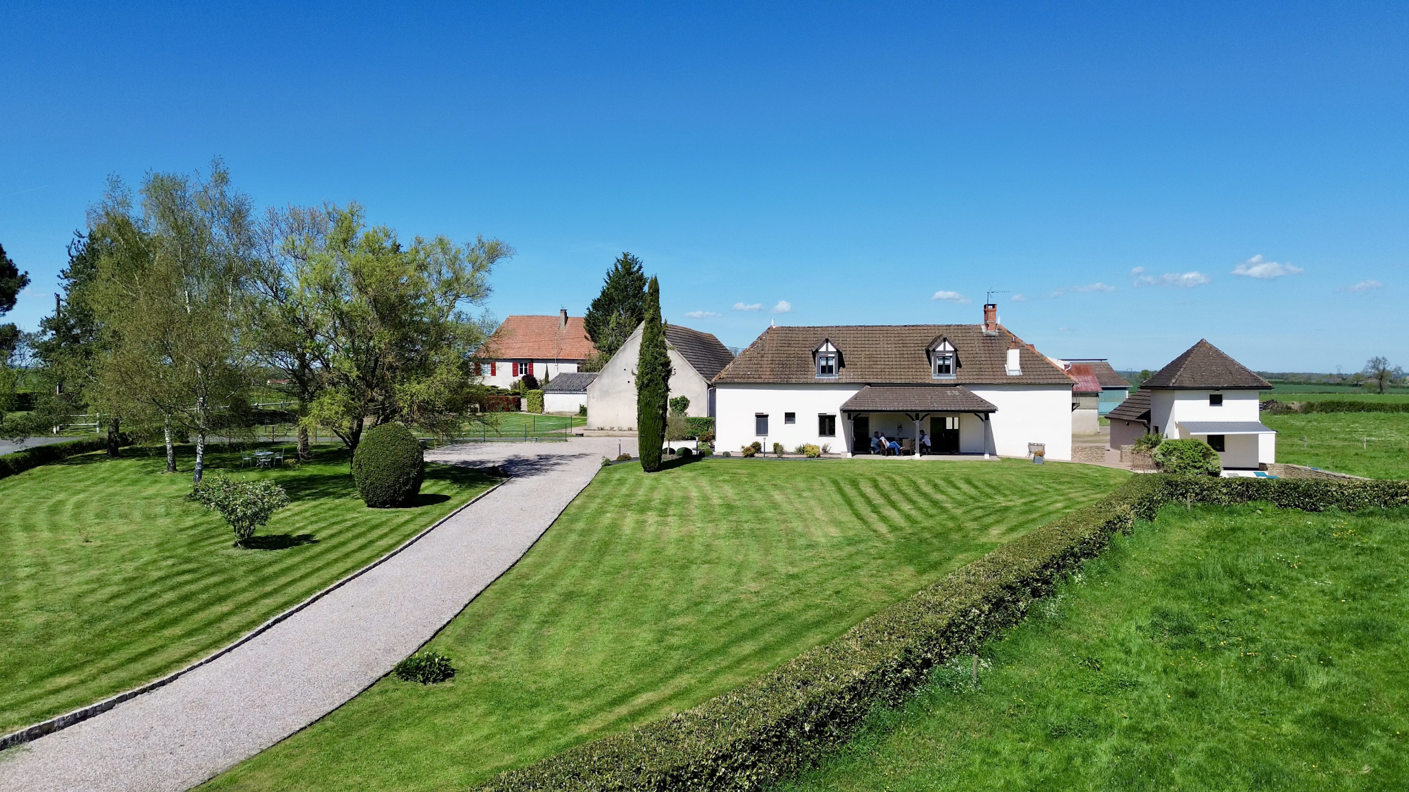 L’ensemble est implanté sur un terrain d’environ 1,3 hectare, bénéficiant d’une vue dégagée sur la campagne environnante, dans une atmosphère paisible et préservée.