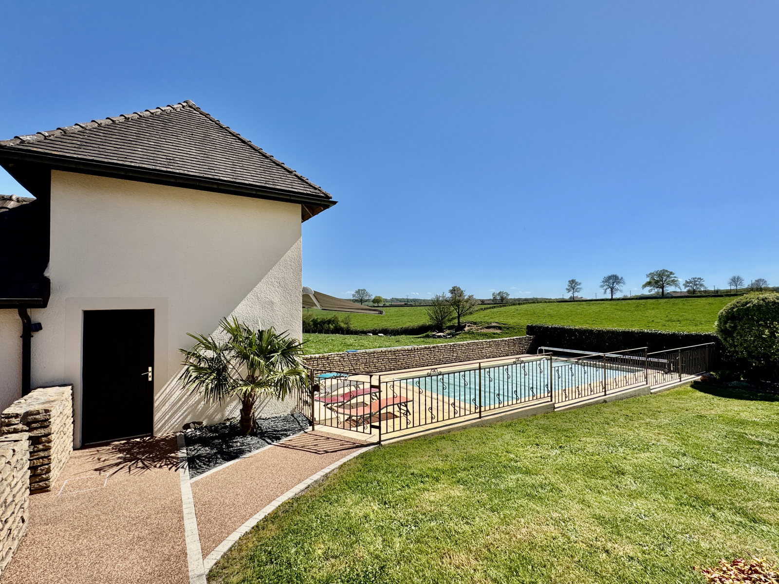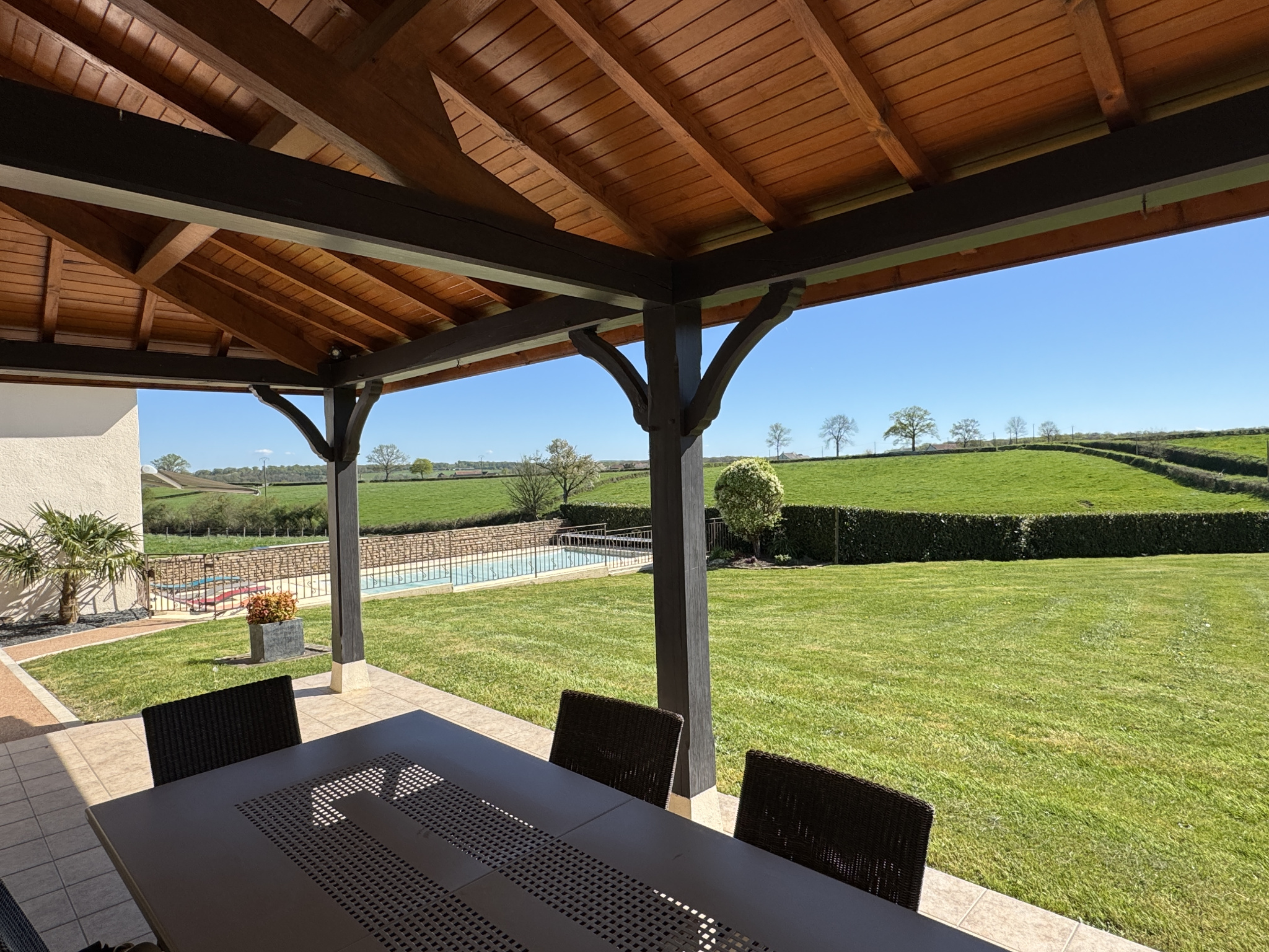 À l’extérieur, une cave, une terrasse soignée, une piscine chauffée avec son espace pool house, une cour élégante et un accès privatif confèrent à l’ensemble un cadre de vie privilégié.