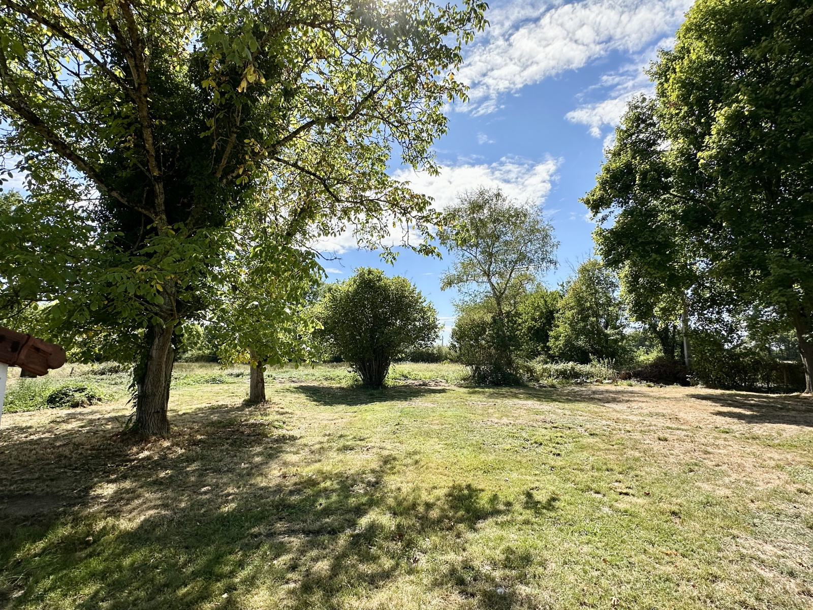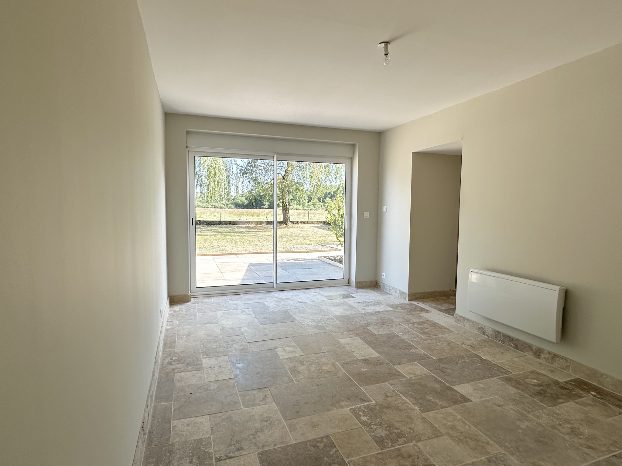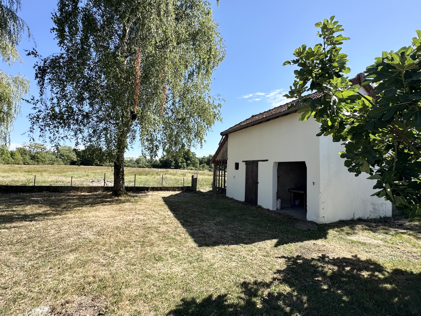 Une belle terrasse permet de profiter pleinement de la quiétude du lieu, avec une vue dégagée sur les prairies et la campagne environnante.