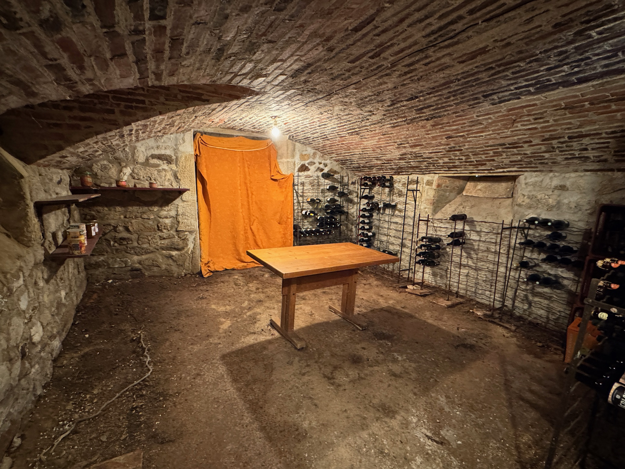 La maison est élevée sur une cave voûtée, avec atelier, garage et chaufferie équipée d’une pompe à chaleur récente.