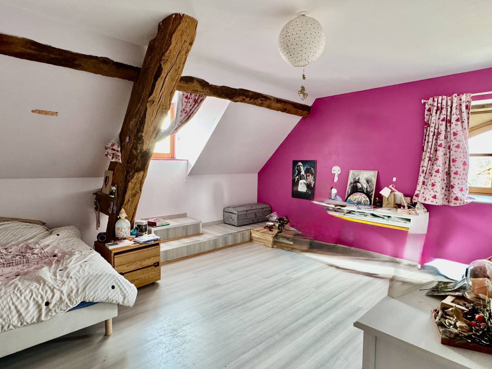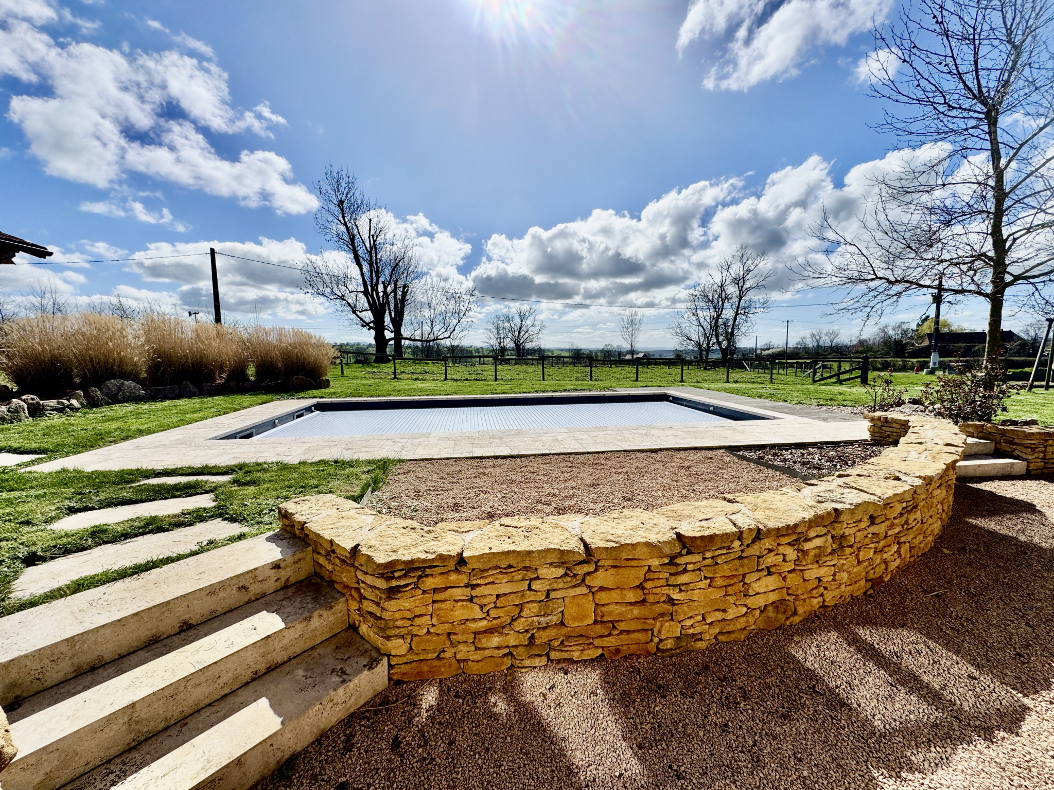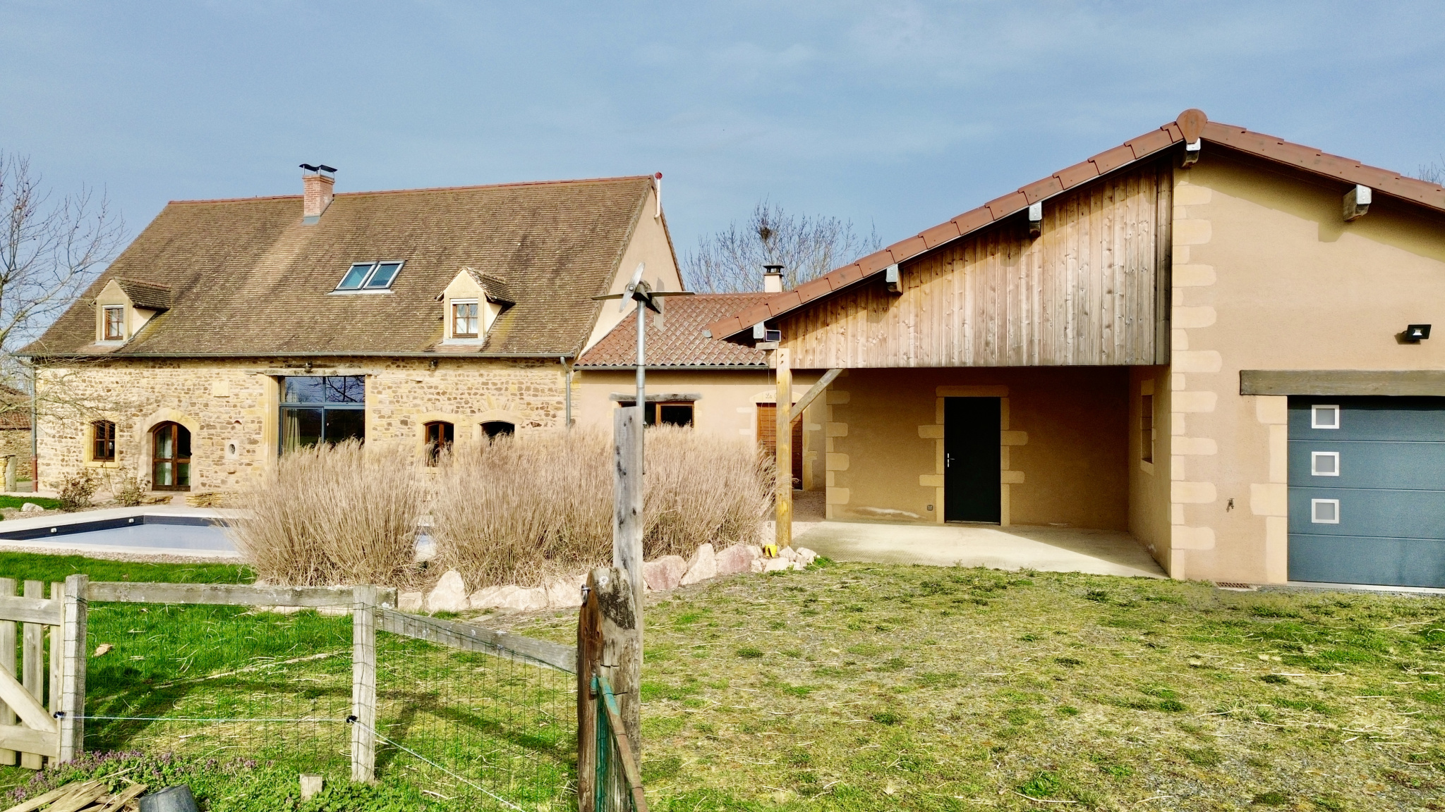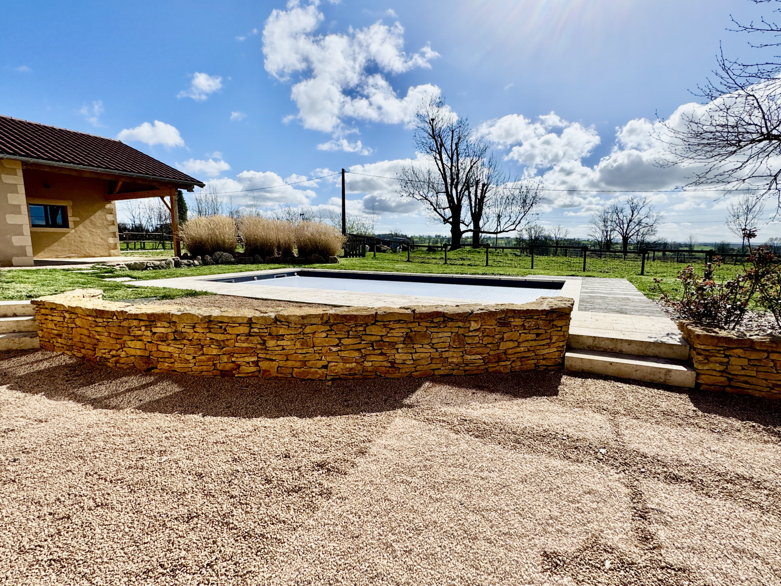 À l’extérieur, un jardin de 2 514 m² entoure la propriété et offre une vue dégagée sur la campagne, dans un cadre calme et préservé. Une piscine de 8 × 4 mètres chauffée par pompe à chaleur vient compléter cet ensemble convivial.