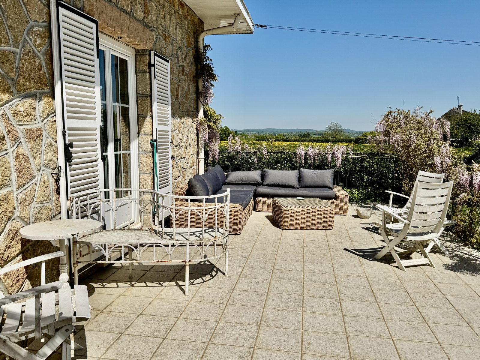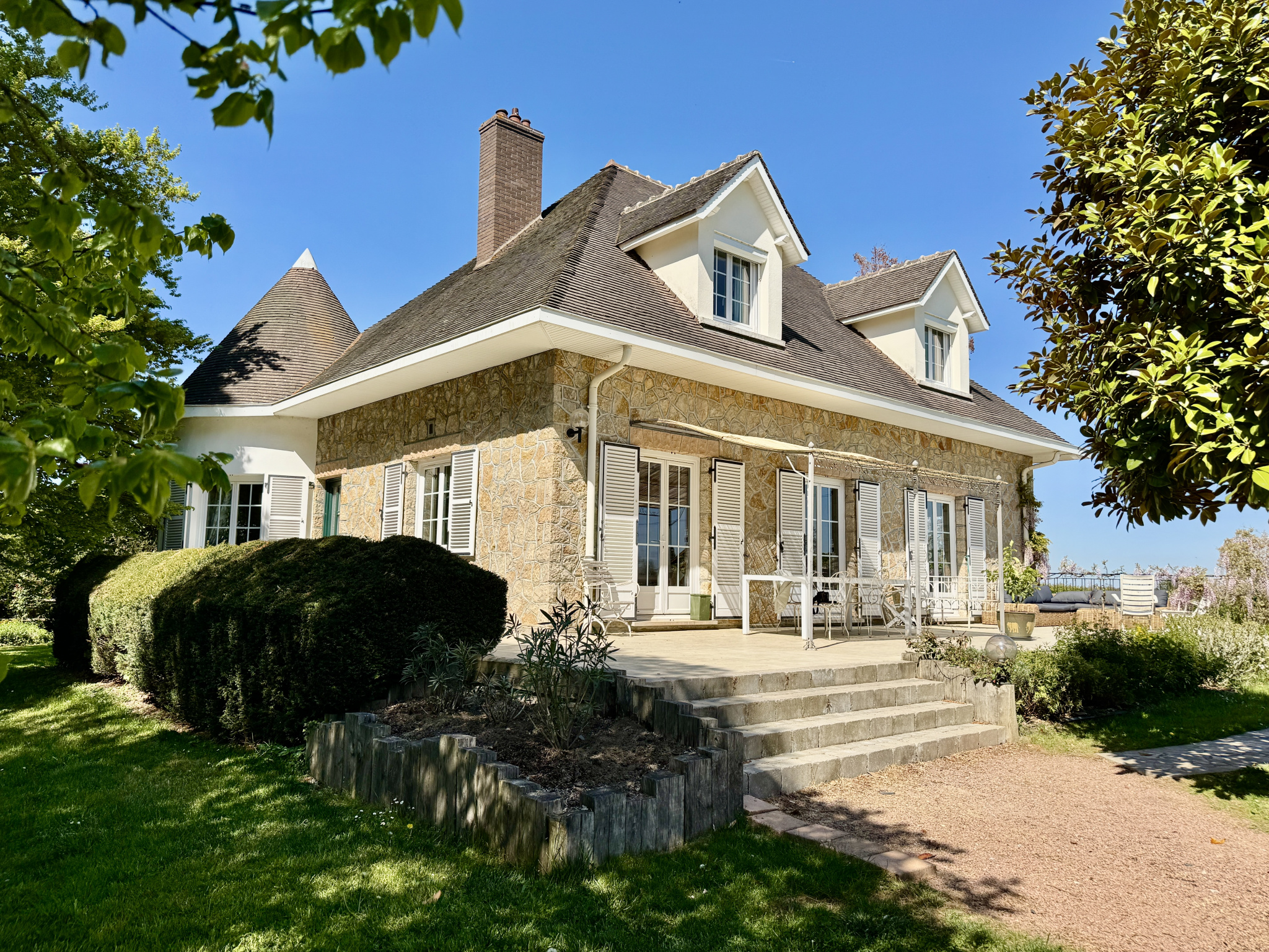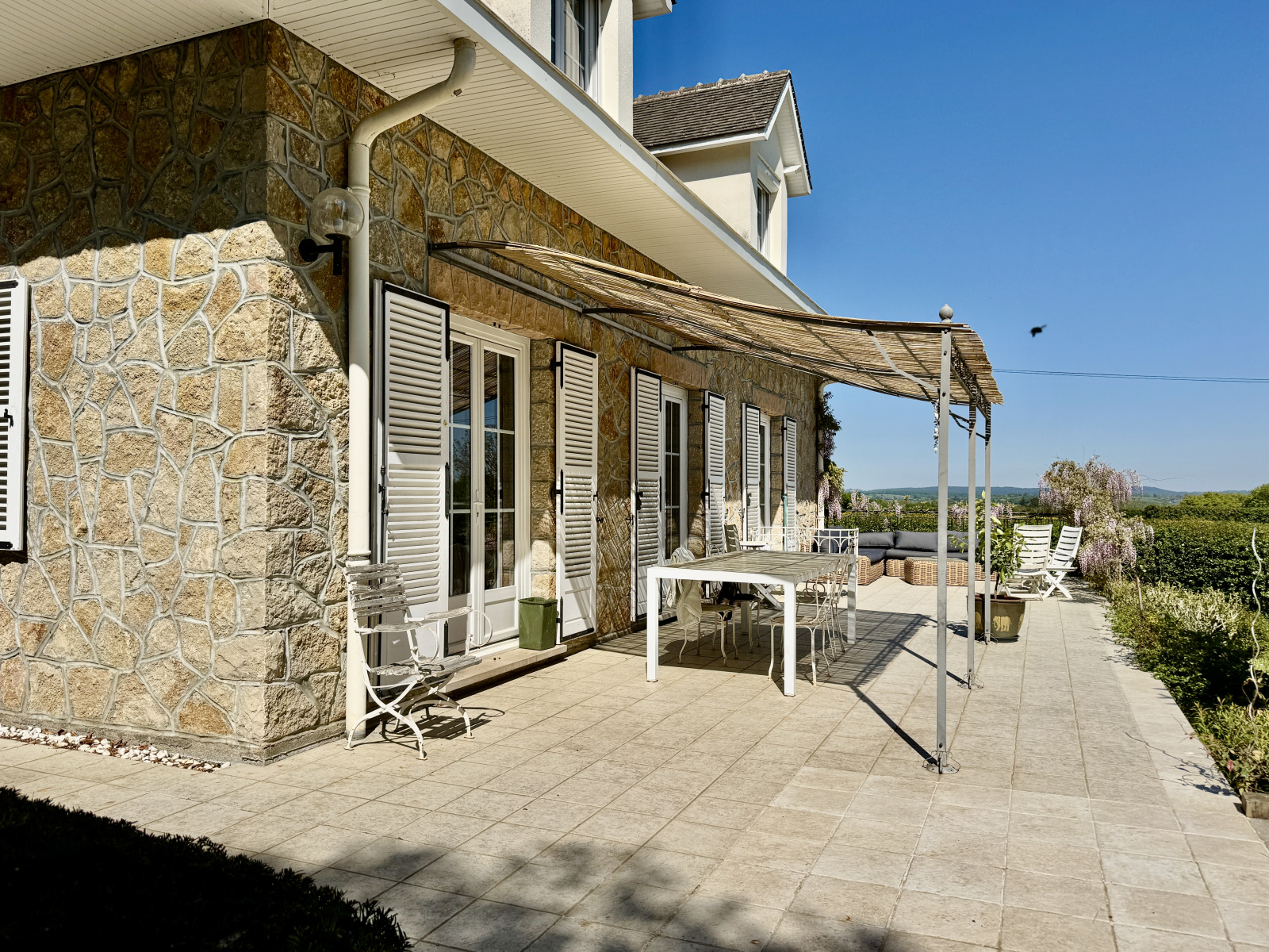 Une terrasse de 100 m² exposée plein sud prolonge les pièces de vie et domine le jardin.