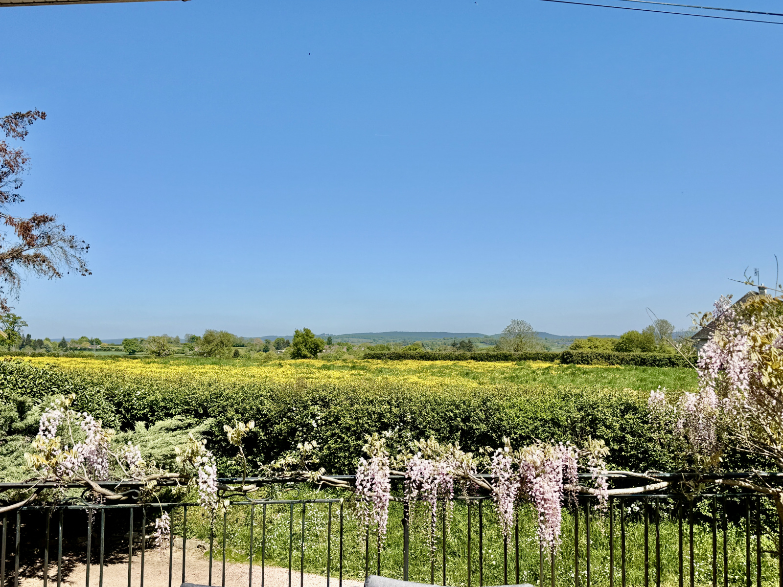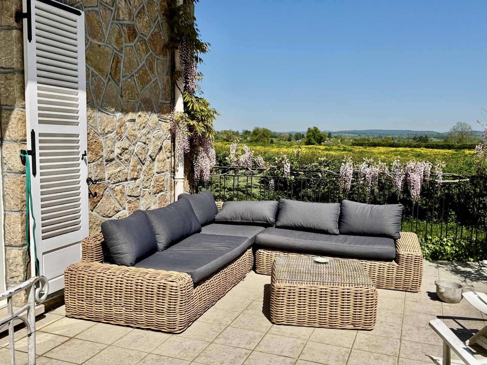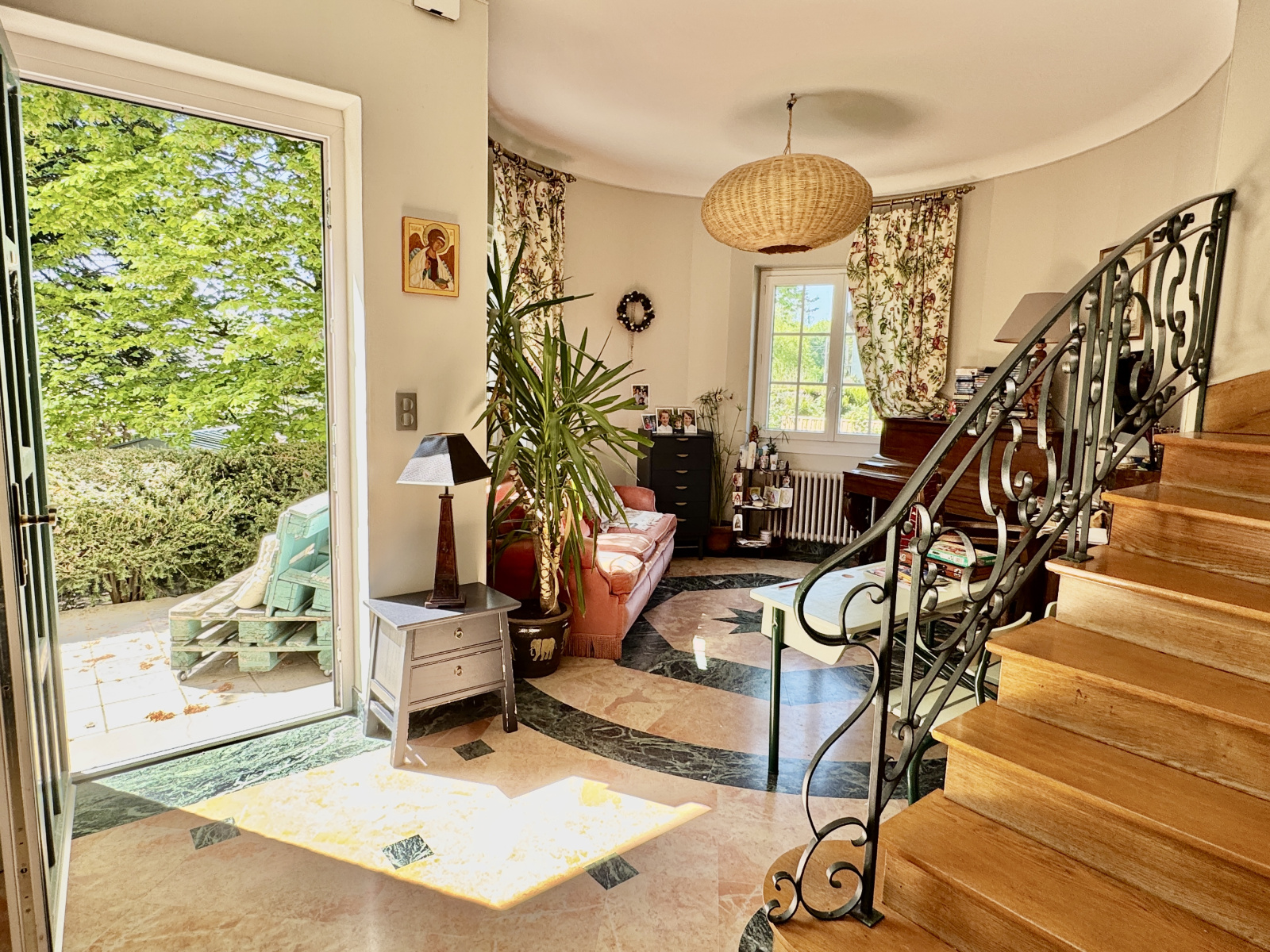 Une terrasse de 100 m² exposée plein sud prolonge les pièces de vie et domine le jardin.