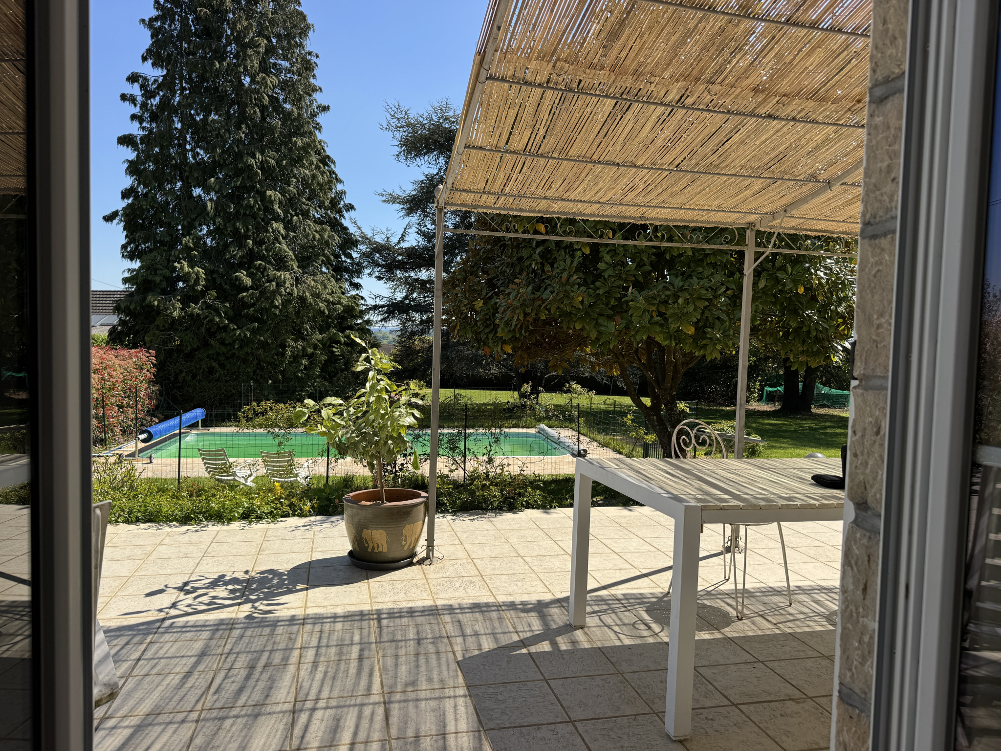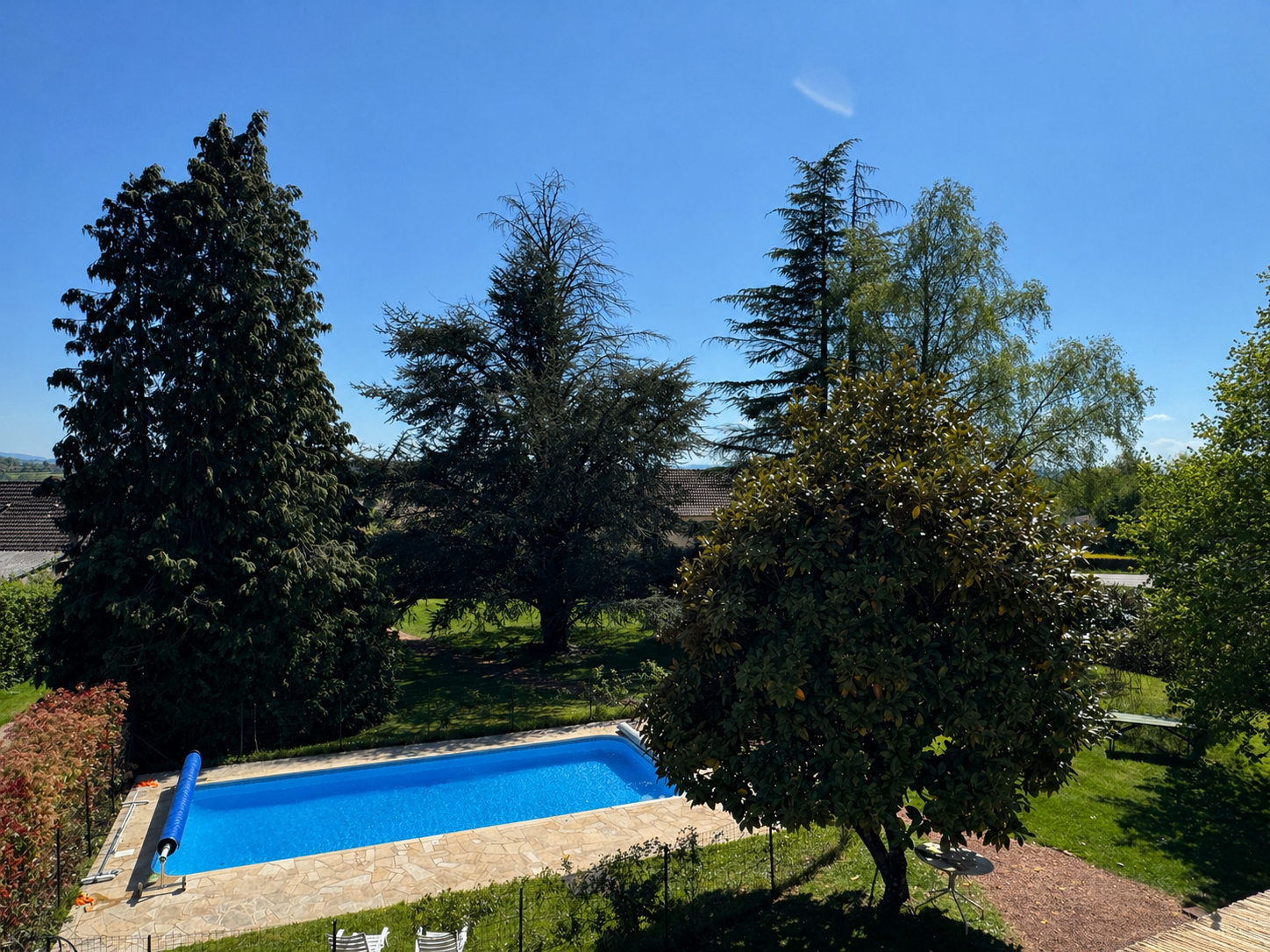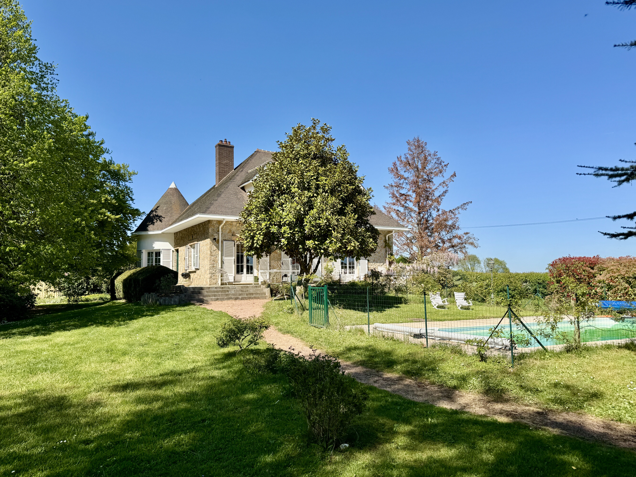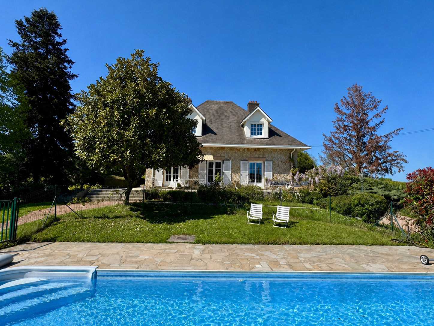 Une piscine clôturée (4,5 x 9 m) s’intègre harmonieusement à l’ensemble.