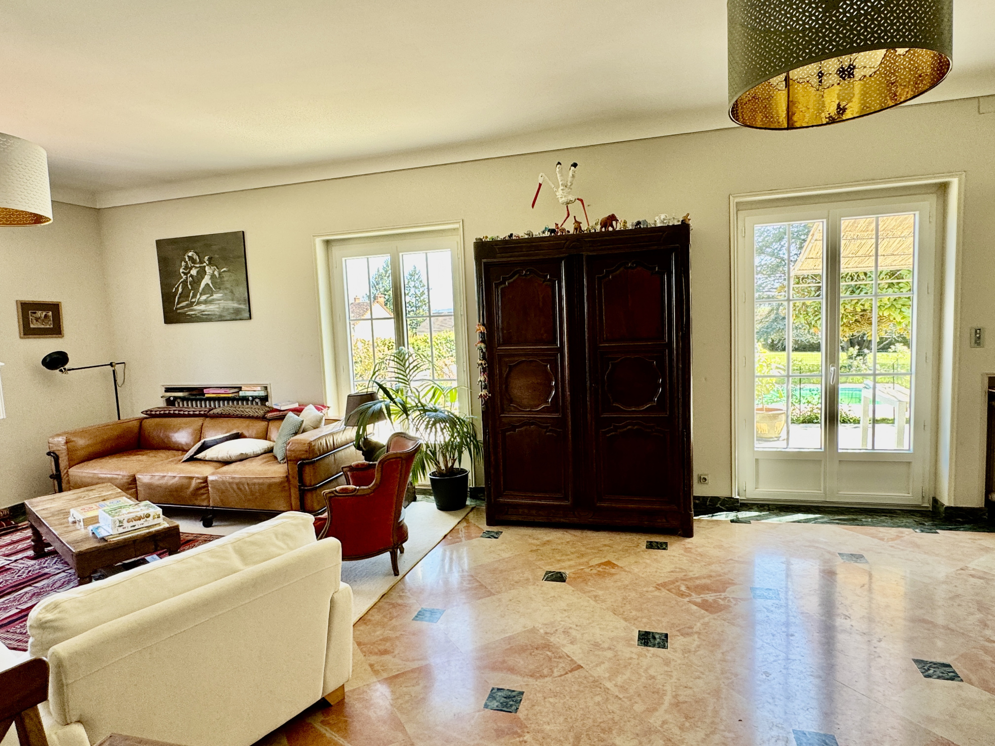 L’architecture de la maison met en valeur des espaces généreux et particulièrement lumineux. Le séjour double de 42 m², prolongé par de larges ouvertures sur la terrasse, bénéficie d’une exposition idéale et d’une vue dégagée sur le jardin. La cuisine, également tournée vers l’extérieur, s’inscrit dans cette continuité fluide entre intérieur et extérieur.